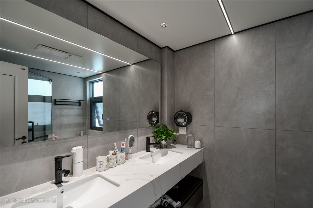 客厅和卧室是主人更多需求方向,对于卫生间而言,简洁易打理是首要条件,墙面是哑光瓷砖,微水泥色有原生气息。