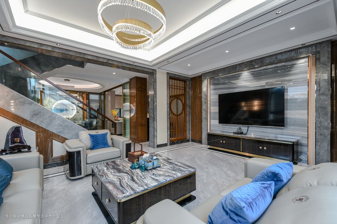客厅整体围绕现代轻奢展开,隐于细部又能发现中式美学缩影,共同发酵产生的设计效果格外协调。