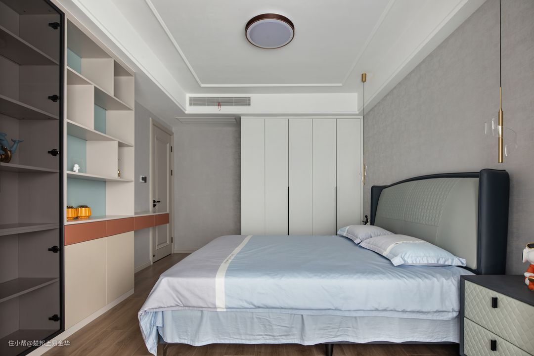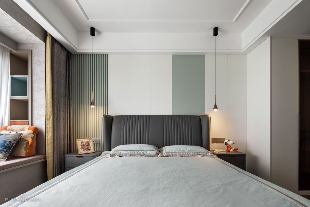 卧室采用简单的顶灯搭配床头小吊灯的设计,空间上饱满但是简约。拼接跳色的背景墙,平面和立体感都有了,层次就比较丰富。