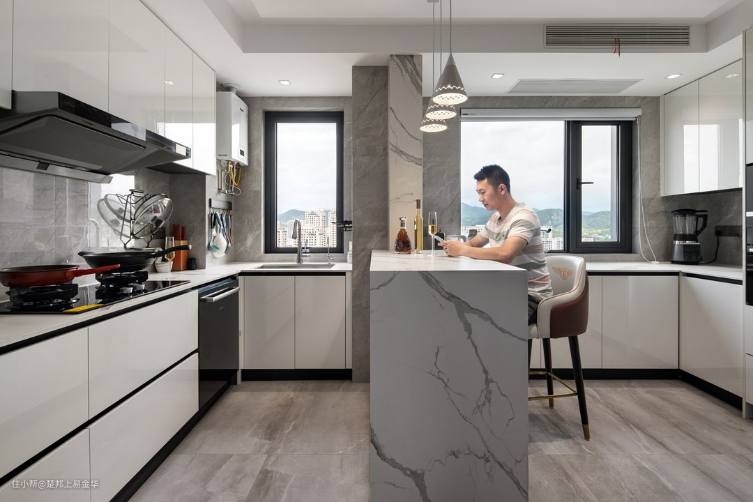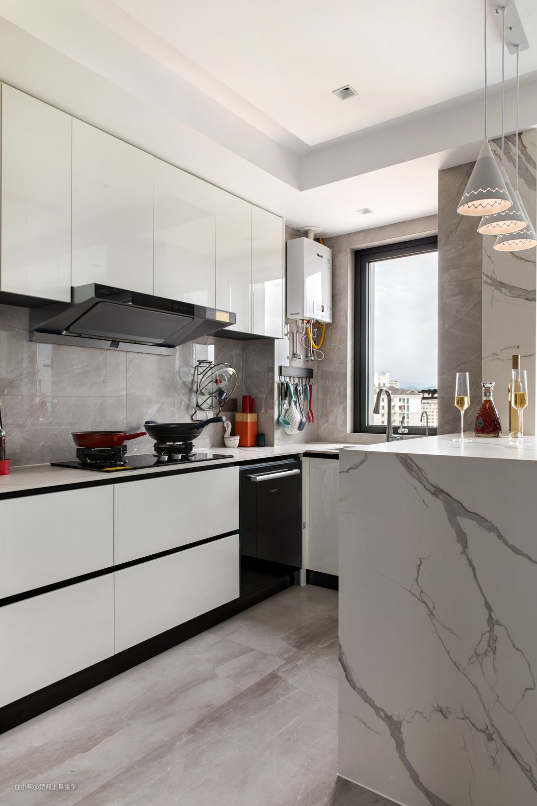 大量的厨柜,不缺乏收纳空间,亮面的材质也比较好打理。吧台下面也有收纳柜,放一些杯子,酒水很方便。