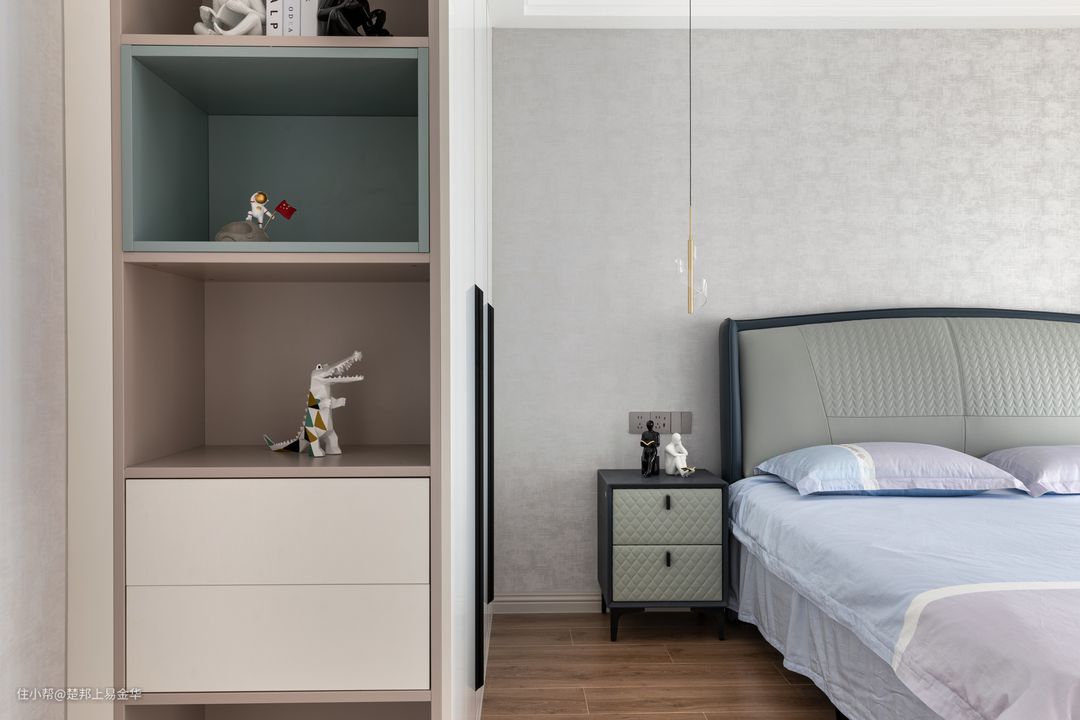 跳色的隔间颜色层次分明,搭配同色调的床和床头柜,整体协调统一。