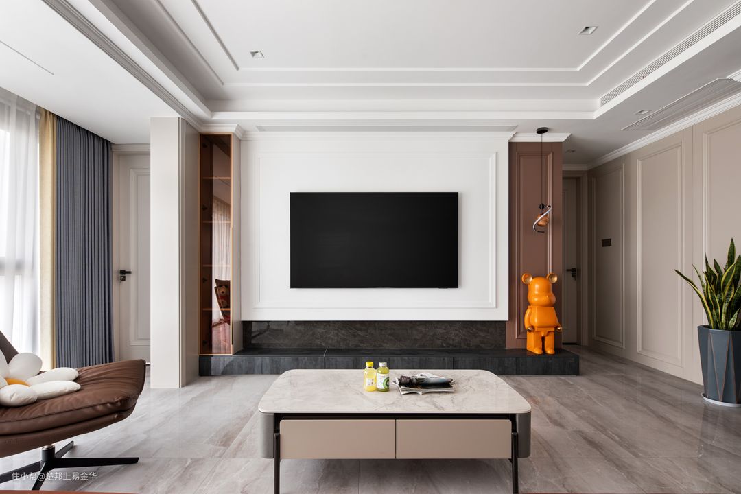 电视背景墙也是同色系的焦糖色,颜色丰富,层次感分明。
