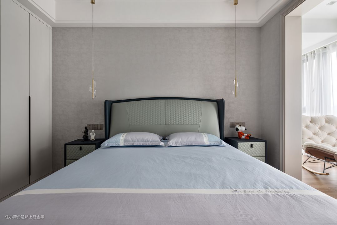 次卧整体颜色饱和度比较低,灰色的墙纸比大白墙更好看。对称的小吊灯也让房间不单调。