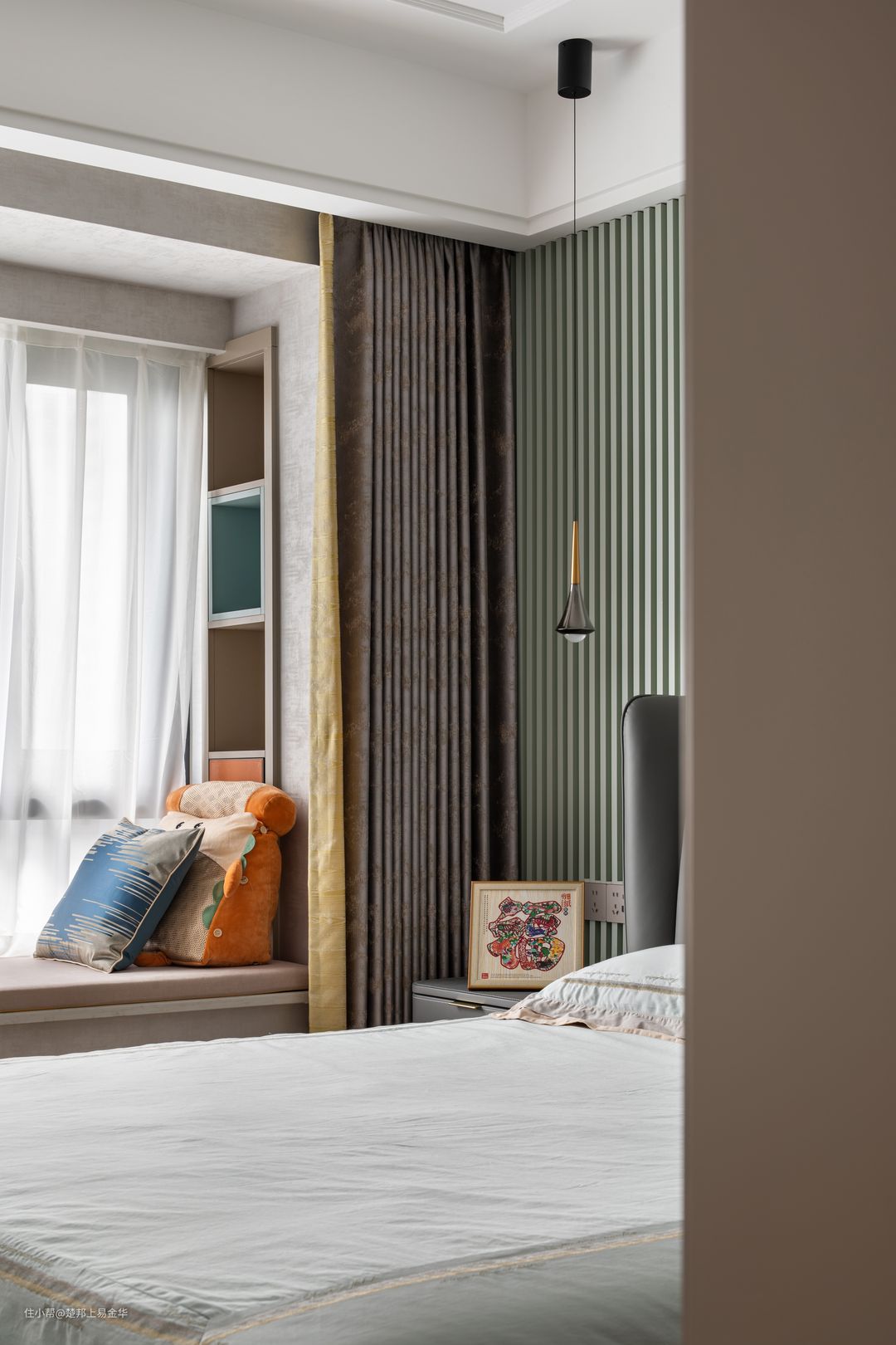 卧室整体的颜色饱和度比较低,灰色系也更加养眼。飘窗柜的颜色也有不同,这样更加俏皮一些。