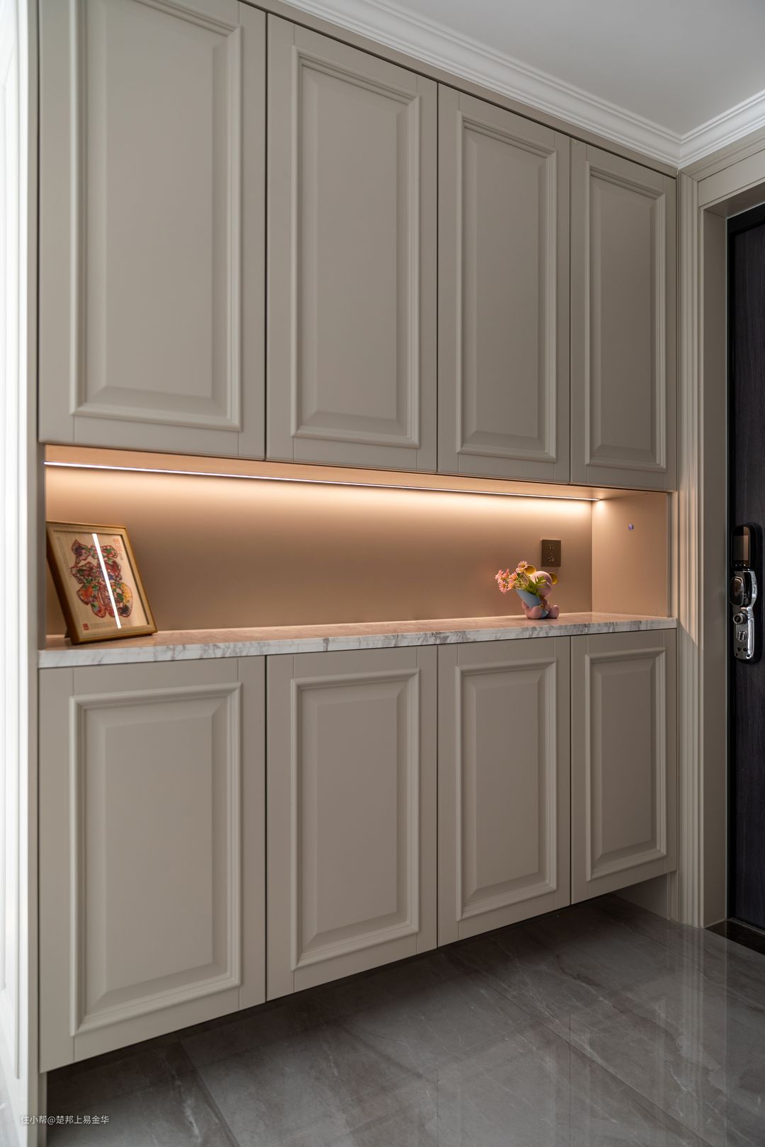 玄关进门,是一组玄关柜,留空处采用大理石台面,打扫时比较方便。可以放包包、钥匙等非常方便。 上面可以储备一些口罩、纸巾出门不用翻找。下面当鞋柜使用,鞋子不会乱七八糟,悬空的地方也可以放日常