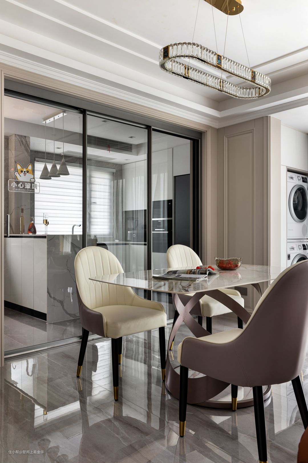 简单的餐桌椅搭配吊灯,餐厅不缺乏照明,不理门隔开客餐厅,不担心油污。