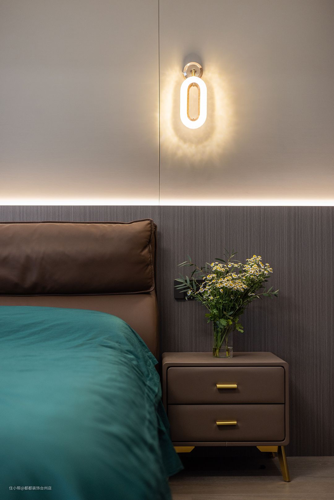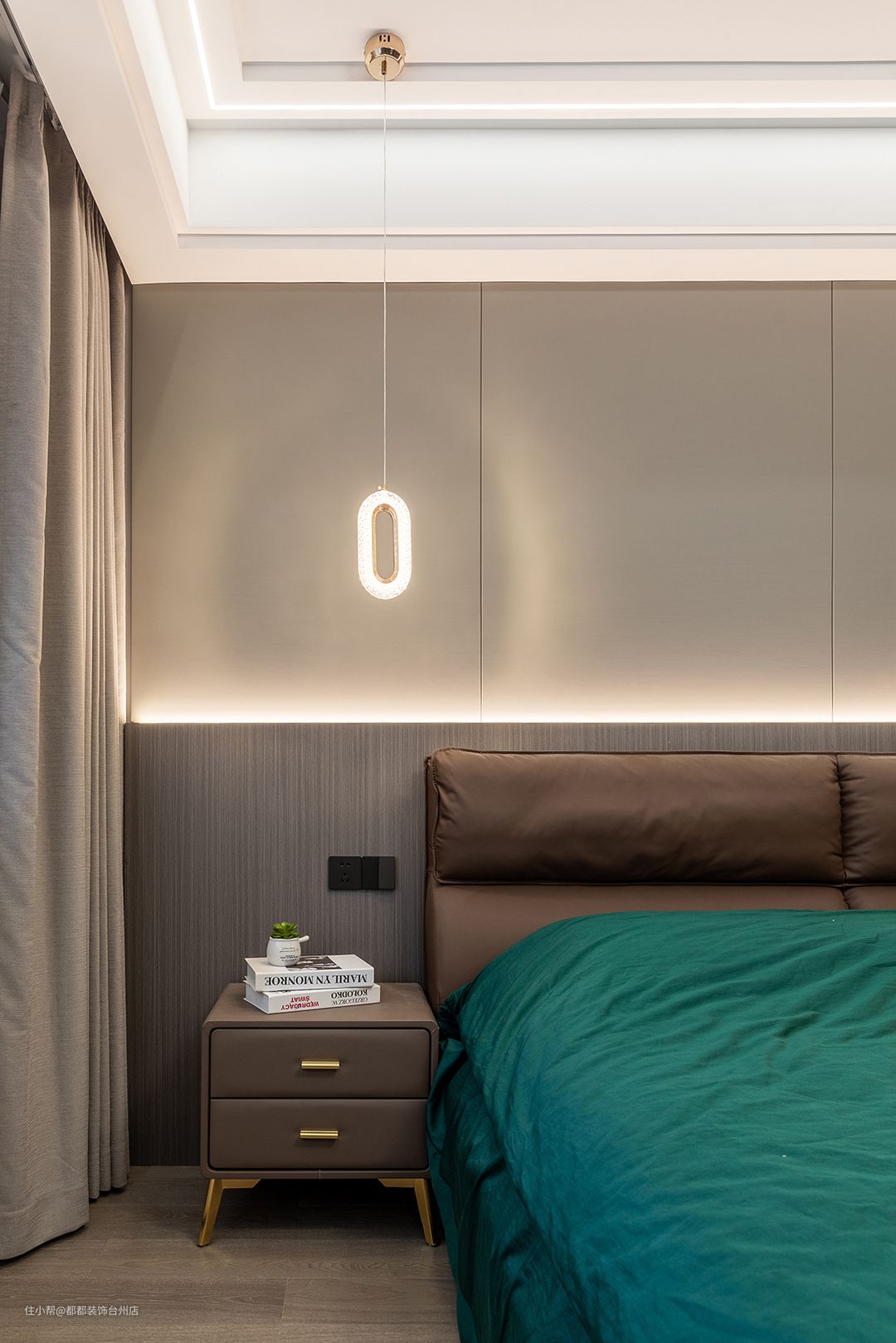 主卧背景墙灰棕色与艺术漆拼接,灯带置入两种材质交接边界,光线氤氲,二者界线趋于模糊,床头两边的椭圆形吊灯让空间更显梦幻迷离。