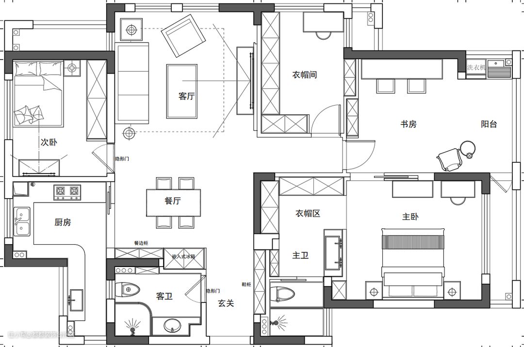 钢筋水泥的城市中,生活也像被按了快进键,本案杨总夫妻俩希望摆脱生活工作中的忙乱,把自己的家打造成一个没有繁杂装饰的静谧港湾,整个家以黑白灰做主色调,潮玩流体熊摆件,小巧绿植鲜花,加上氛围灯烘托,空间好似被打上了一层柔光滤镜,黑白灰的家中也能治愈感满满~ 户型分析: 1.原户型是比较经典的户型,玄关处布局空旷,没有很好的被利用起来; 2.主卧功能分区模糊,动线不流畅; 3.卫生间没有干湿分离,常年潮湿。 户型改造: 1.入户空间重新规划,布置出专门的储物空间,满足屋主收纳需求。 2.主卧进行墙体拆改,采用装饰玻璃墙隔出卫生间干区,使用时更加自在,视觉上空间也更显朗阔。 3.卫生间干湿分离提高屋主生活质量。 玄关 客厅 餐厅 卧室 书房