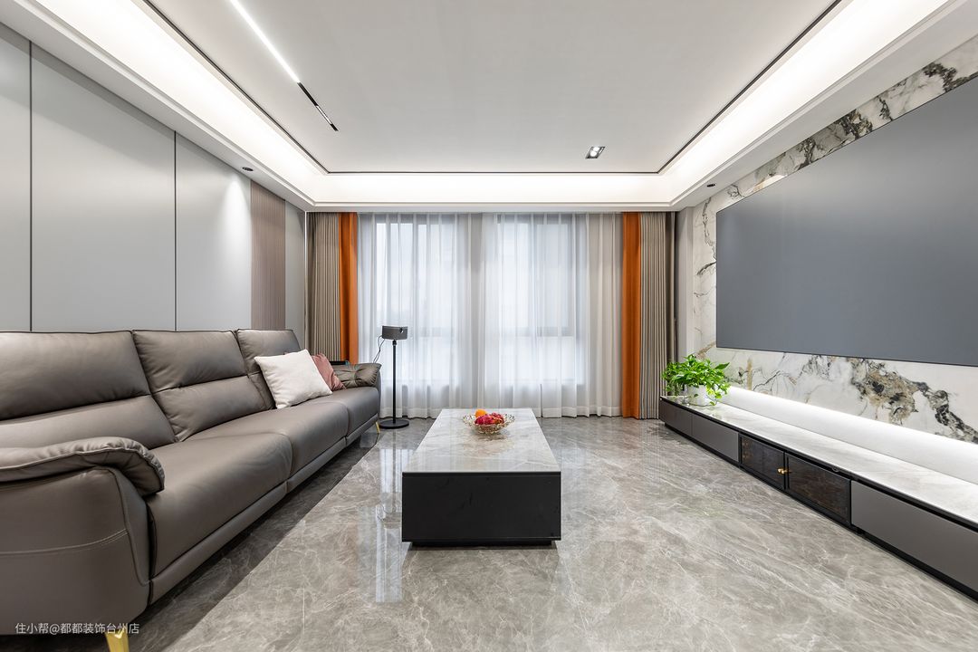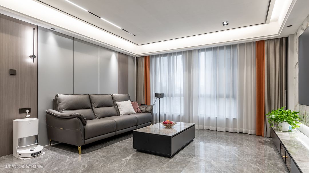 客厅的光影随着一天中时间有着深浅且细腻的变化,有时候爬满了慵懒,有时候是跳跃的韵律,丰富着空间的情调内涵,三人位沙发柔软质地让空间多了随性自在,大理石小几通透简单,小巧体型缓解大沙发的严肃刻意。
