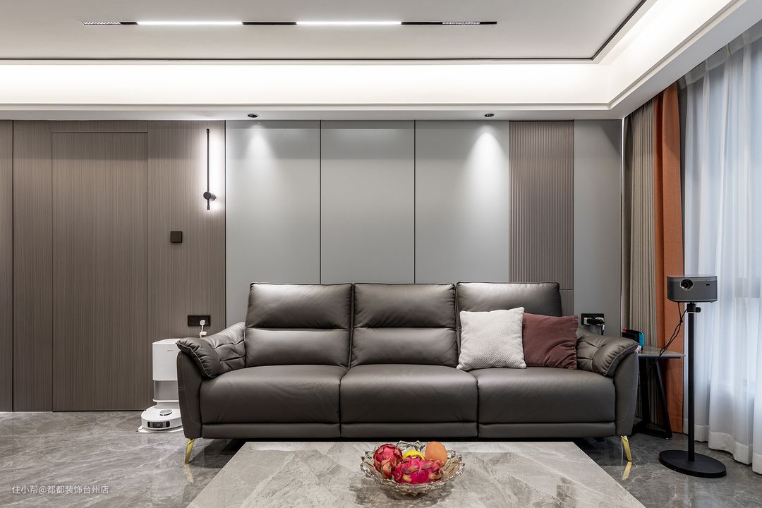 杨总家的入户空间在这次得到了重新规划,布置顶天立地式储物柜并留出一方悬空置物台,用于收纳进出门钥匙包包,置物台选择黑色木板,整体柜面为高级的银灰色与家里的轻奢风格很搭。