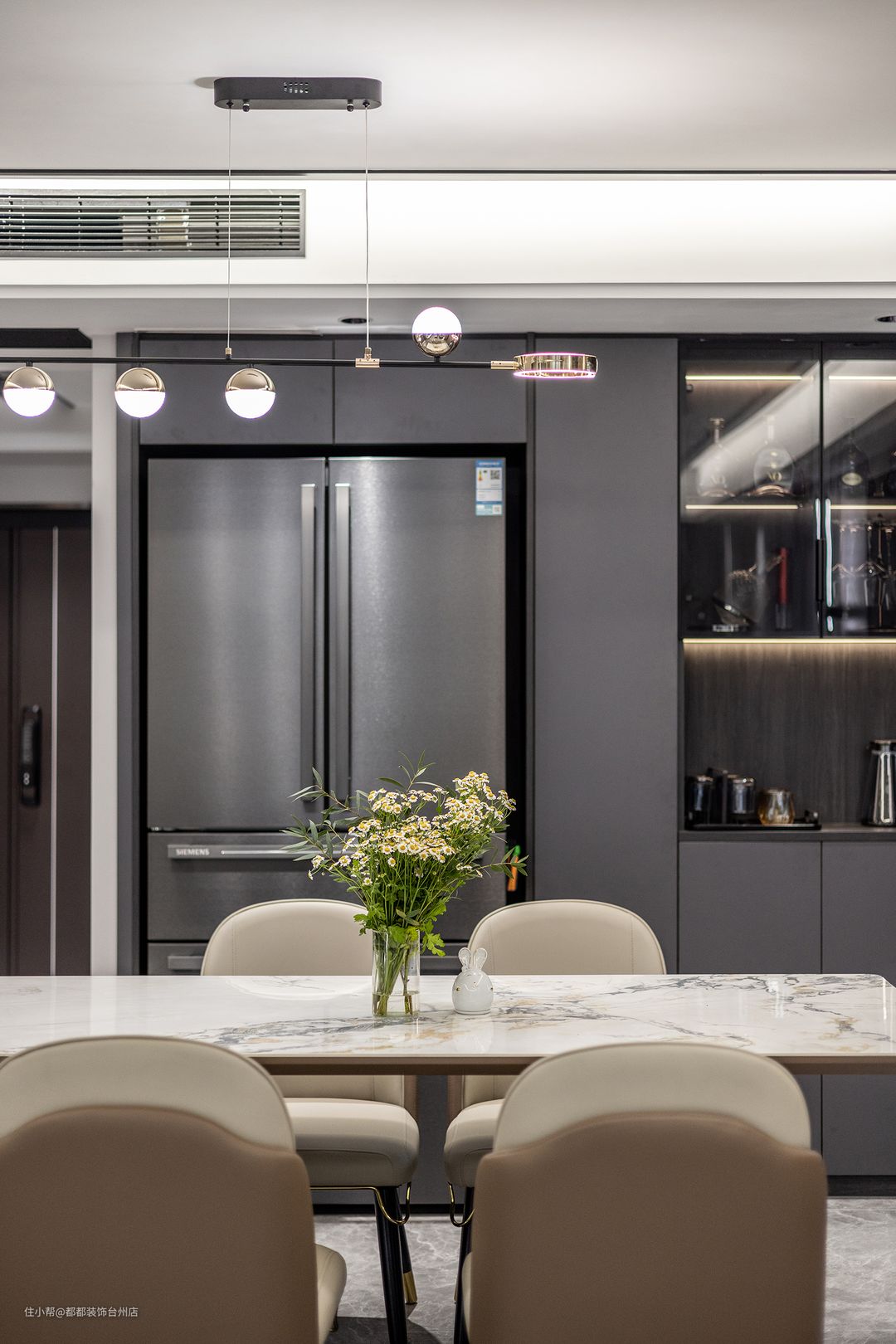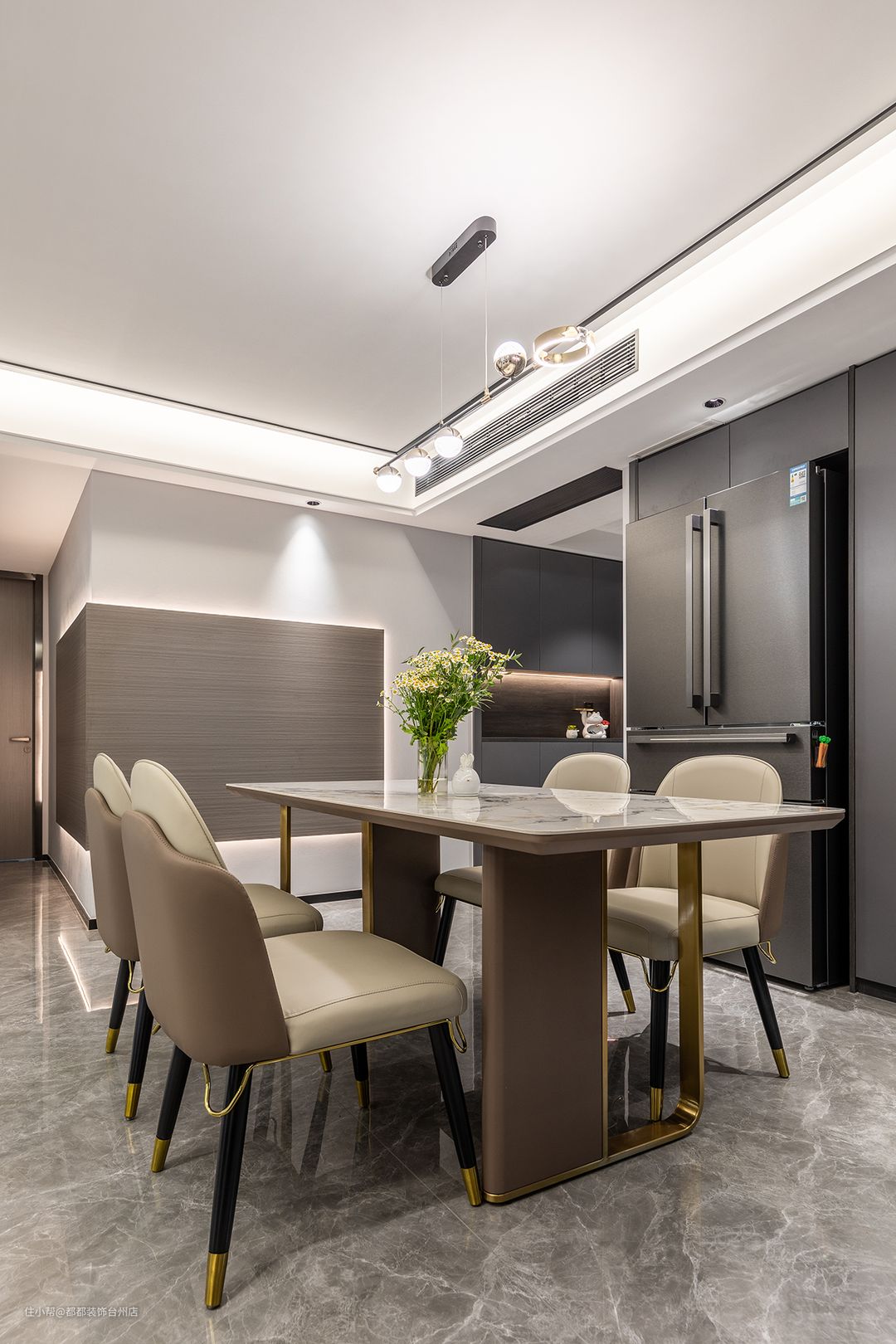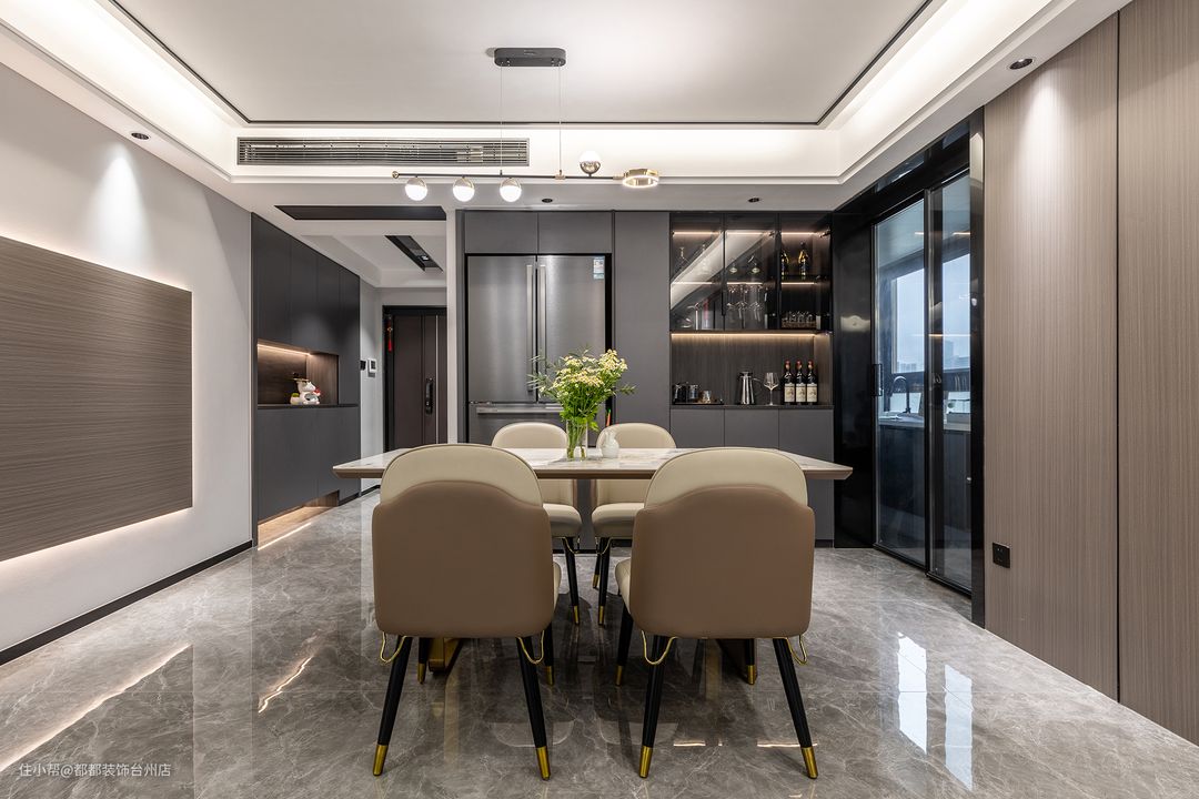 厨房引入的自然光到达餐厅,成为构建空间的重要元素,自然光与氛围光交织,让餐厅有了随时间变化的不同质感,摩卡色调的餐桌椅和木饰面背景格外的搭配,精巧小花瓶搭配三两绿枝,自然与现代碰撞出独特的艺术氛围。