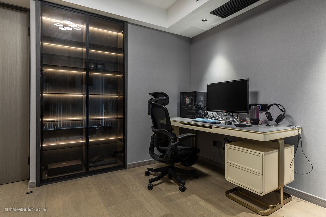 悠悠然然,生活常欢,书房设计跟随杨总的意愿以素雅简淡为主,冷色调给人以宁静闲逸,集思考、放松于一体,解压又治愈,周末是夫妻两人的休闲时光,卸下一周的不愉快,畅汗淋漓的来一场游戏对决吧!一家人在欢乐的时光中得到感情的升温。