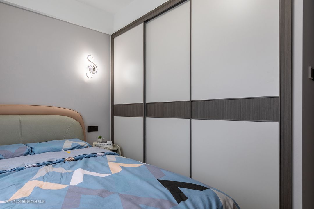 靠墙布置通顶柜,推拉门的设计对于小房间超级实用,也能满足屋主日常衣物的收纳需求,床头摒弃笨重储物柜,以收纳台代替轻便灵活。