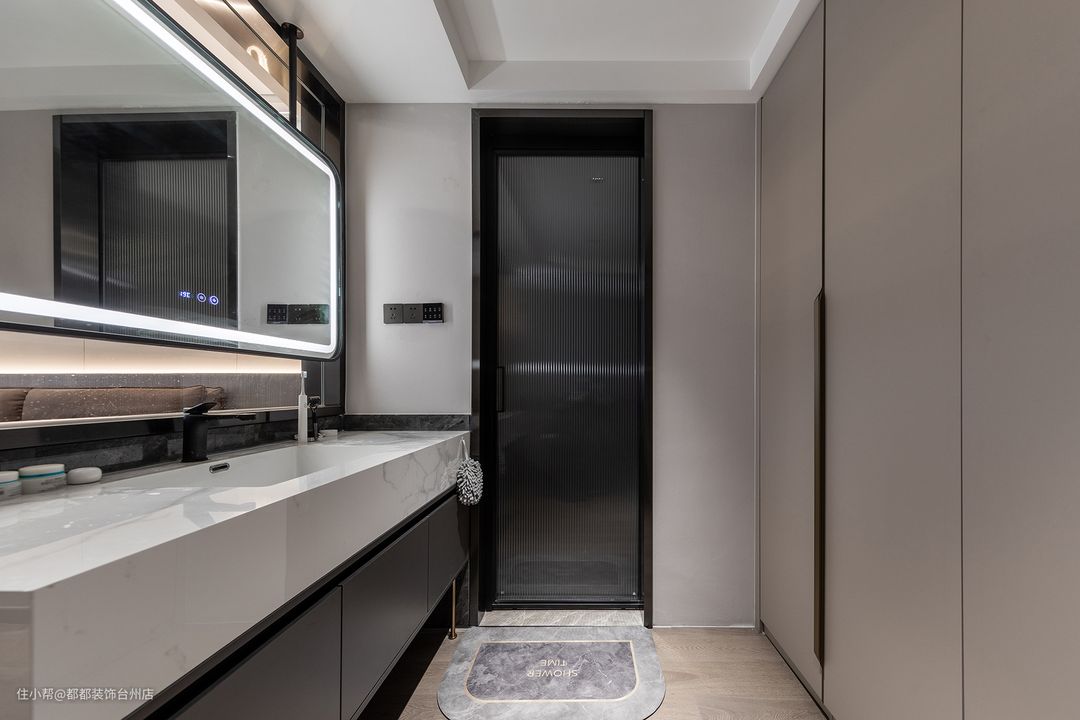 主卫高级灰艺术涂料赋予空间大气稳重的气质,大理石岩板台面自带的肌理让空间呈现出毫不费力的高级感,宽敞的化妆镜大气统一,同时避免床头正对卫生间的尴尬。