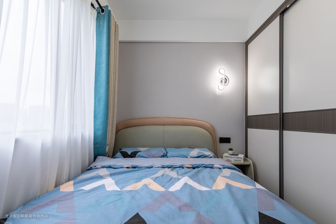 次卧 蓝色床品自带清透感,同时也让整个卧室充满灵气,壁灯小巧精致能给人以恬静而舒缓的休憩体验,仿佛时光也慢了下来,悄然融化了身与心的压力。