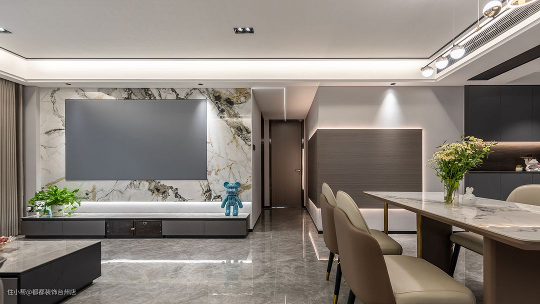 超大投影仪满足多种观影需求,一列地柜依墙布置,增加收纳空间的同时,其上的绿萝和蓝色流体熊也成为电视背景墙的独特装饰,潘多拉岩板规整的纹理让空间视觉内容更为丰富。