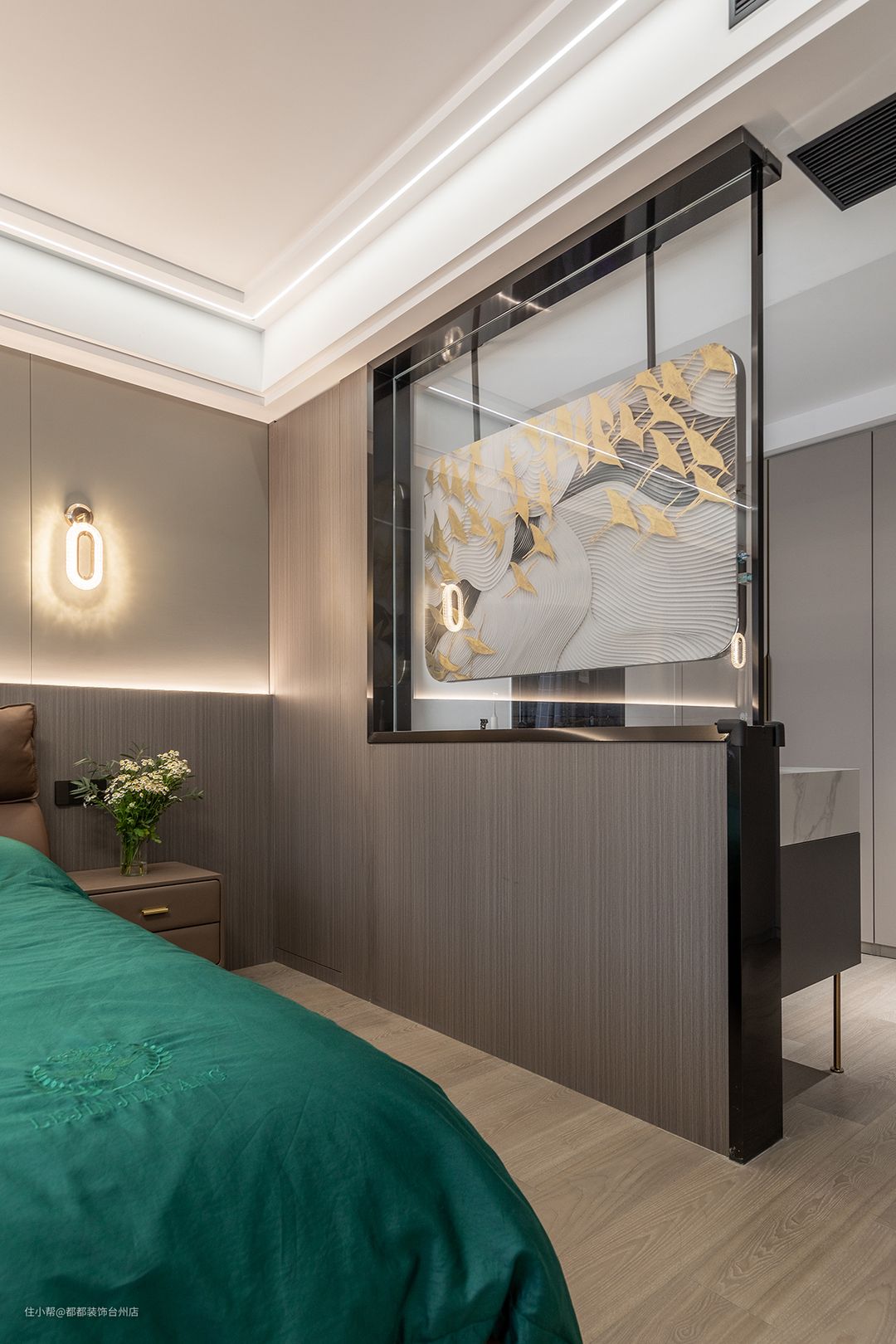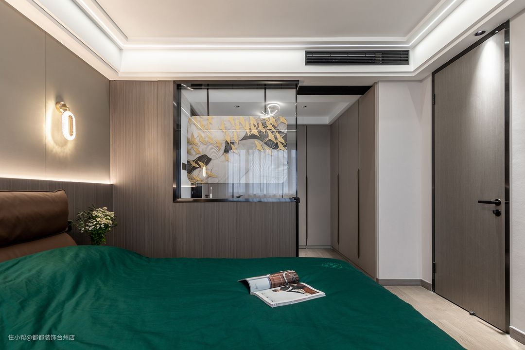 主卧与卫生间采用半墙玻璃屏风隔开,金灿灿的银杏叶随风飘扬,轻奢气质不言自明,流畅环形灯不显繁复,在简约的空间中也不显突兀,光线洒落,空间治愈感满满。