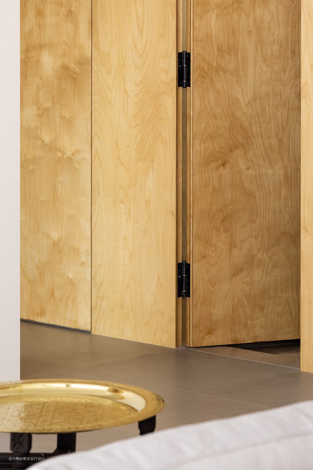 走道空间也是房门的集中处,用桦木海洋板来统一墙面护墙和门的材质,房门都更换成隐形门,原本狭长又凌乱的走道被统一成整体。