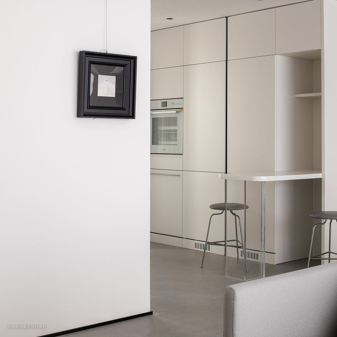 固有的厨房空间十分有限,我们需要另觅它处,补全功能和收纳,在原本的餐厅位置通过充分的规划,在一面墙的区域将蒸烤箱、洗碗机、冰箱、收纳与吧台统统实现,并且为厨房和独立书房的进出留出充裕的动线距离。纯白的西厨是在考虑功能之余,还是想把纯净的「感觉」表达出来。