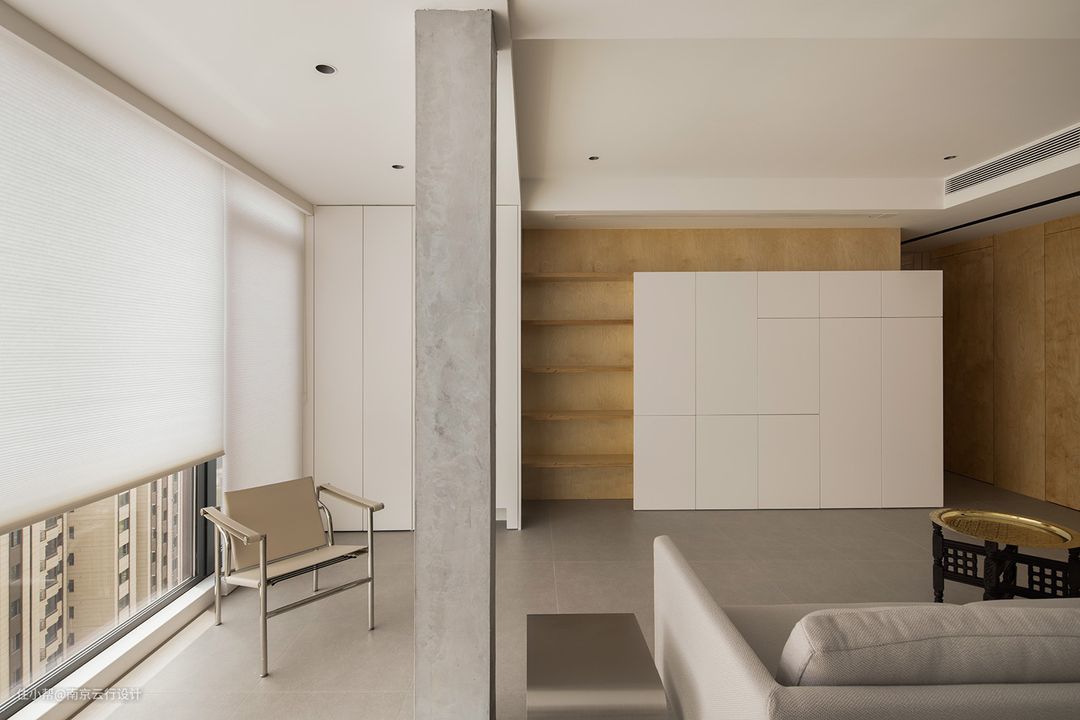 房间的非承重墙体被敲掉后,在公共空间留下了一根布满细钢筋的柱子,经过粉饰之后意外的有了清水混凝土的效果,伶仃的柱子在这个地带虽是朴素裸露的样子,却成为了室内空间建筑感的来源。