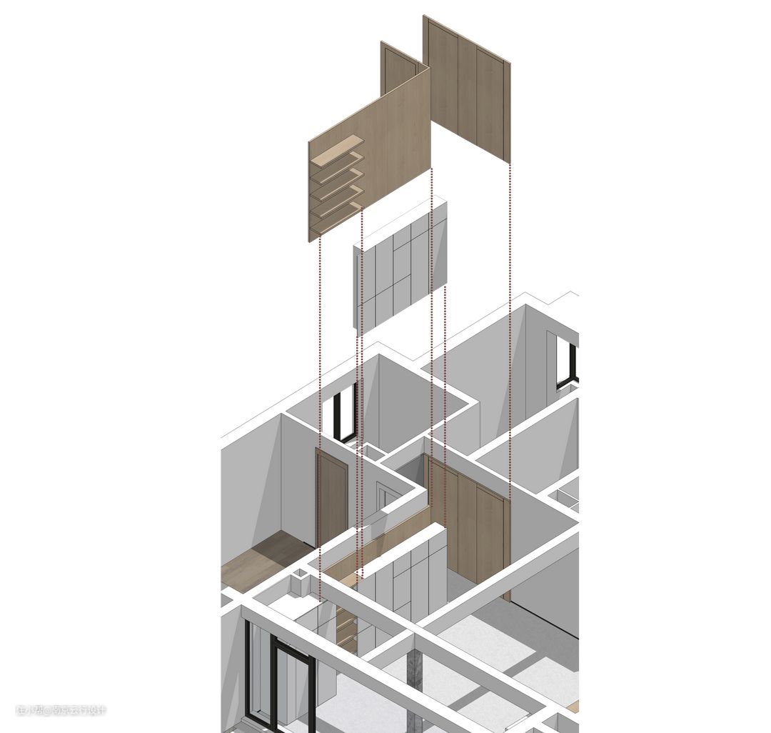 对于书柜的内部结构分割,我们做了一些高的低的、宽的窄的、打开的封闭的处理,希望可以提供到不同类型的储物功能,以尽可能包容到后期使用。比如屋主大量不同种类的书籍能够更合理的在这个区域中存放,还有包括遮挡住电箱位置,以及同属一体的玄关鞋帽收纳。