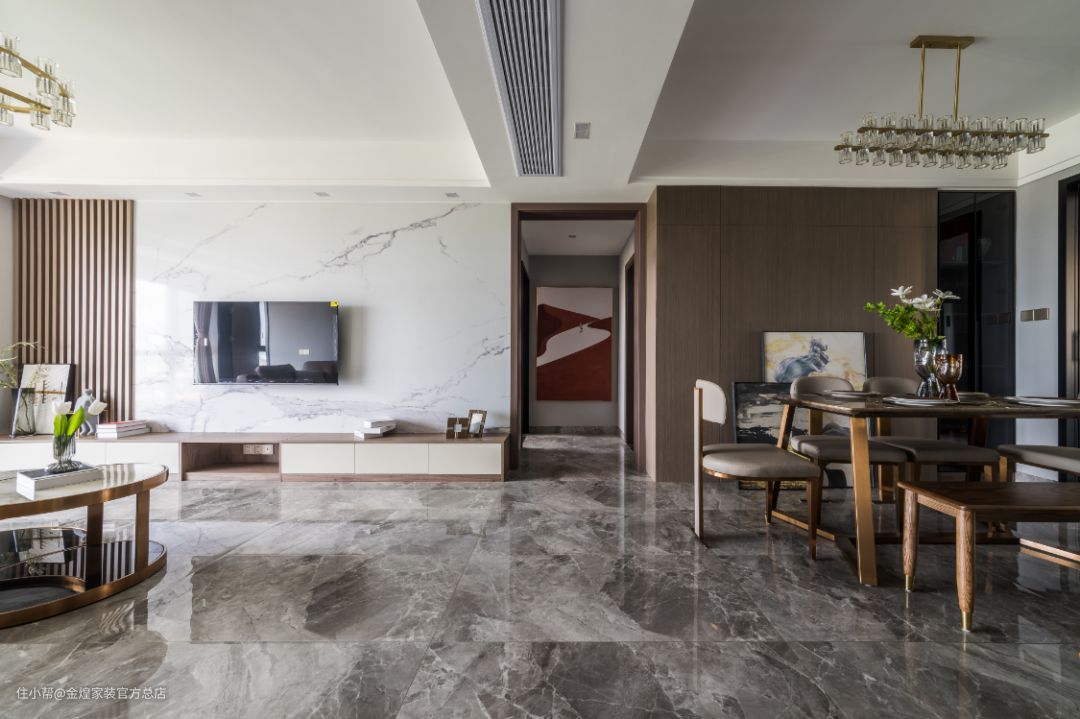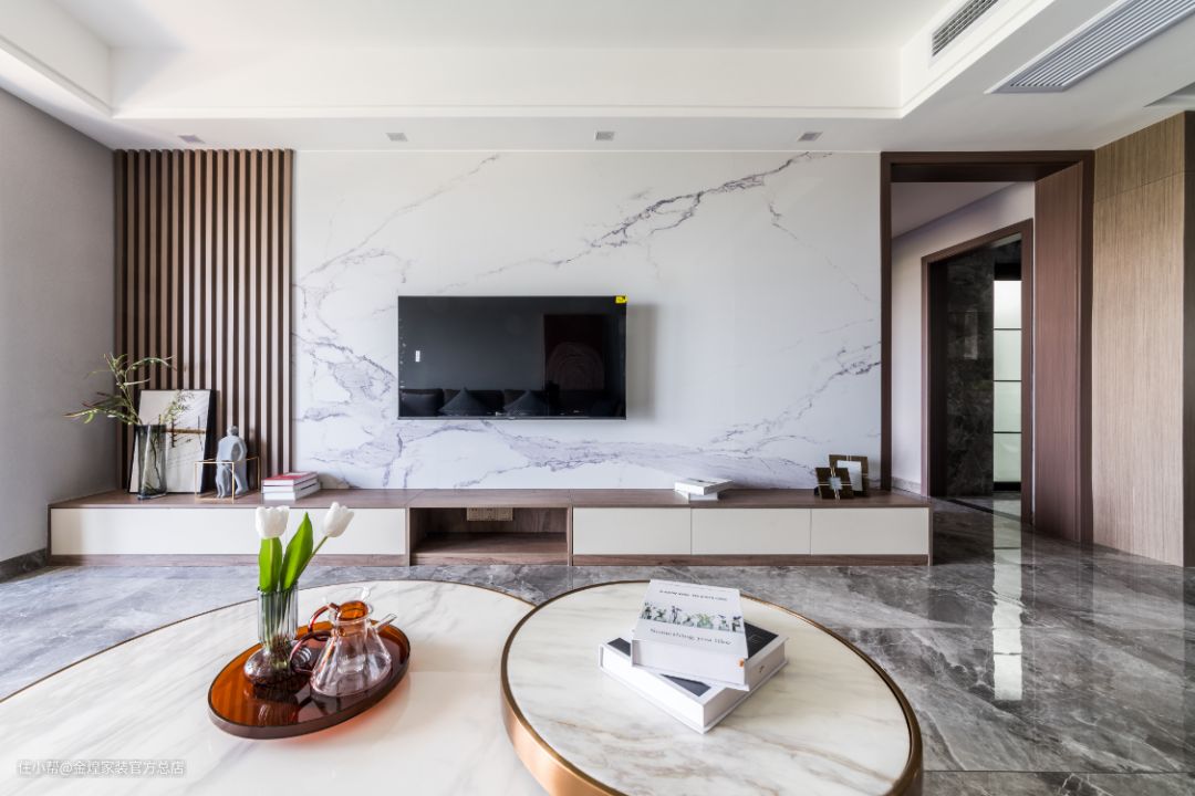 仿大理石背景墙的天然肌理与木饰面相结合,二者相互呼应,使得整体空间和谐而不具有割裂感,整个空间层次丰富,光线充足,清新舒适。值得一提的是别致的圆形茶几,不仅充满设计感、颜值高,关键是百搭,随随便便一放,层次感立即呈现。