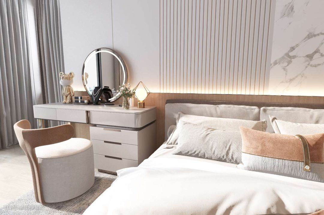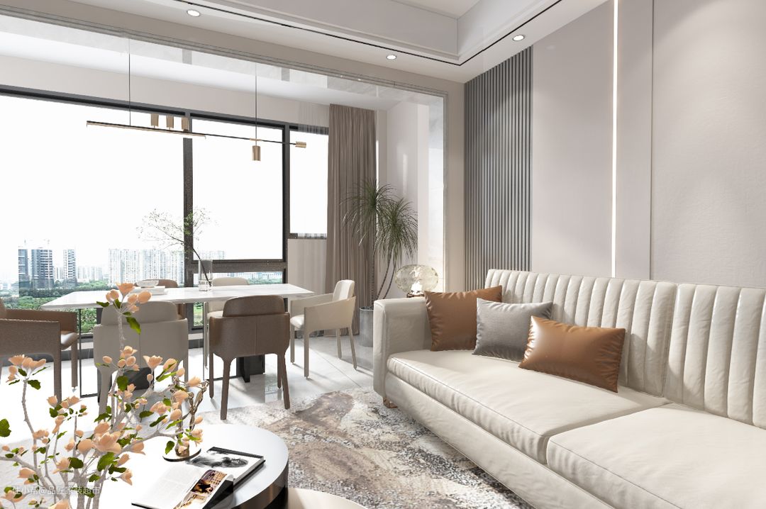 在整体的设计风格上偏向奶油风,奶咖色的沙发、地毯和桌椅给人一种安逸恬静的感觉,整个空间简单却不单调。
