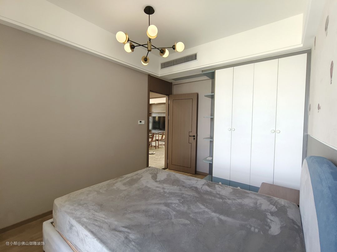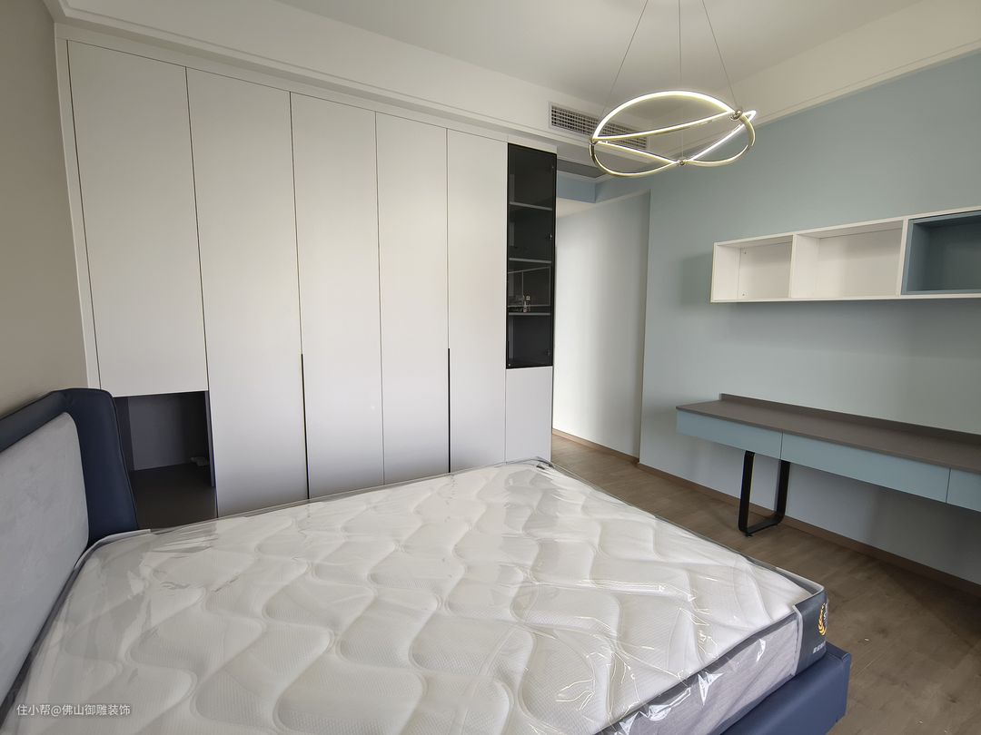 次卧主要是哥哥睡。素净整洁,整体搭配以低饱和度的色彩为主,为哥哥打造舒适宁静的睡卧氛围。 嵌入式的暖白色储物柜,可藏可露,方便满足哥哥日常中的收纳与使用。