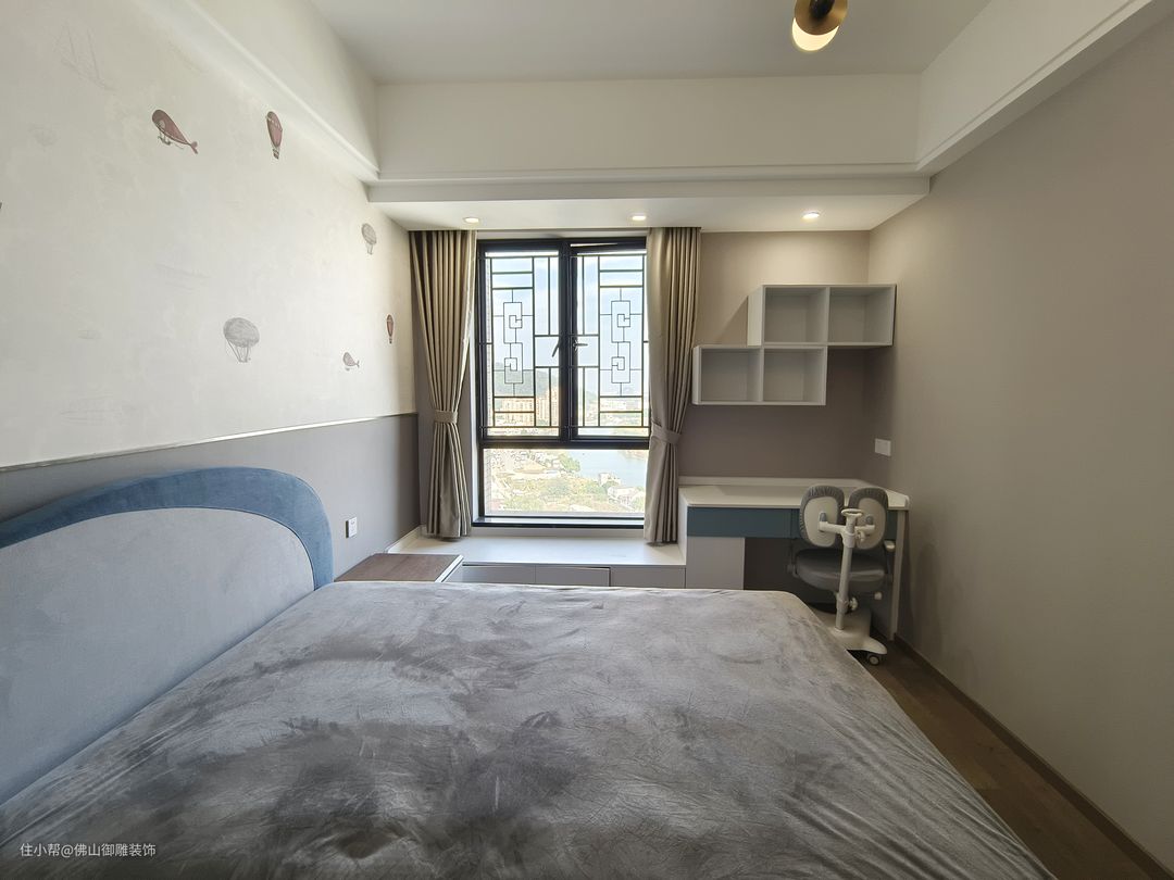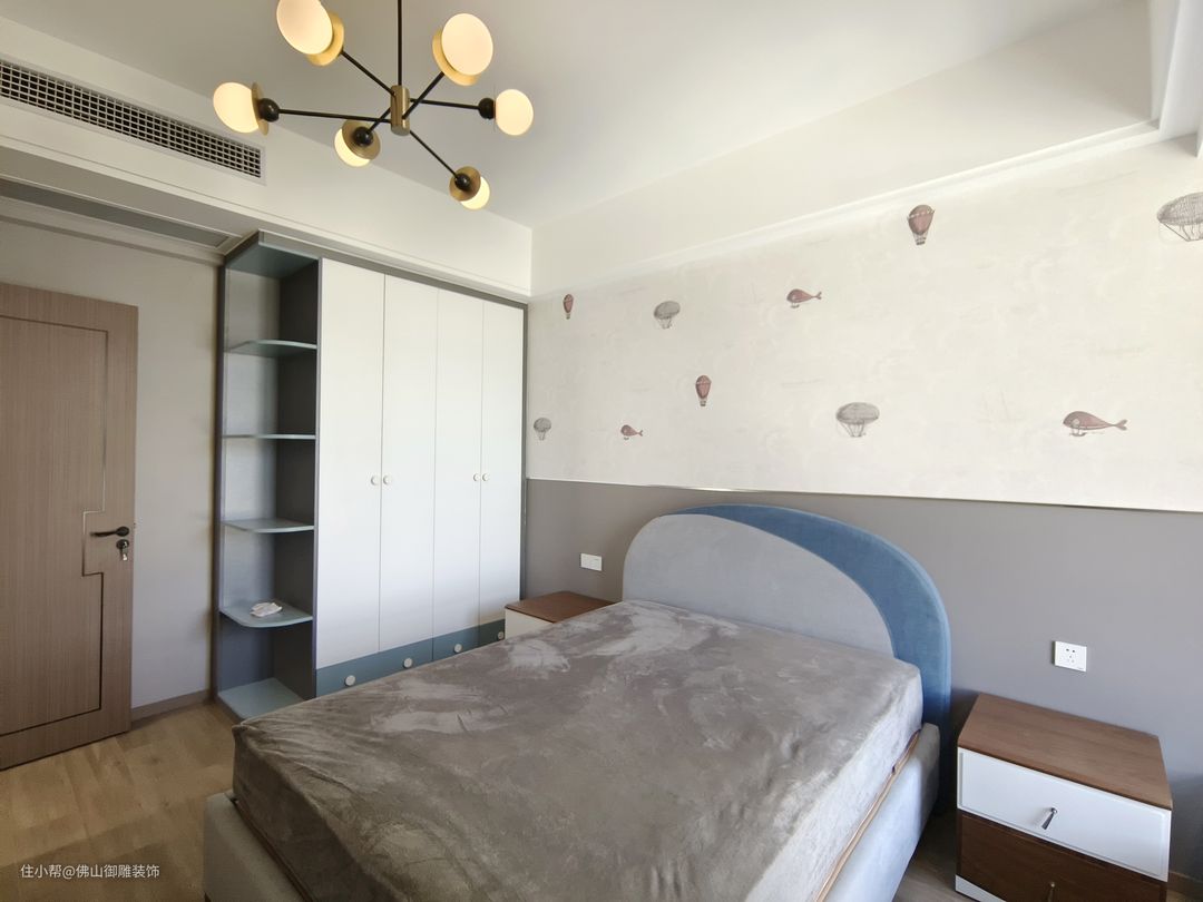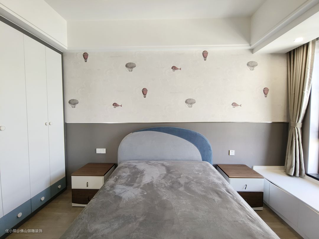 儿童房以简雅的风格来呈现,蓝色的点缀为空间融入了童趣与活力。设计师特意设计了一个具有包裹感的床头,给予萌娃睡眠安全感。床的侧面收纳柜,满足儿童平日生活收纳需求。