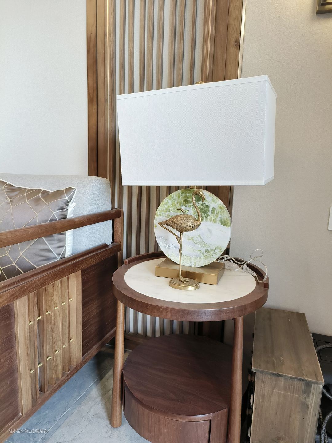 一个沙发边几灯装饰,写意月浮于空、竹影婆娑的自然意境,抒叙“林断山明竹隐墙”的诗意,同时竹影轻轻落在地毯,延续流淌一室的清雅氛围。