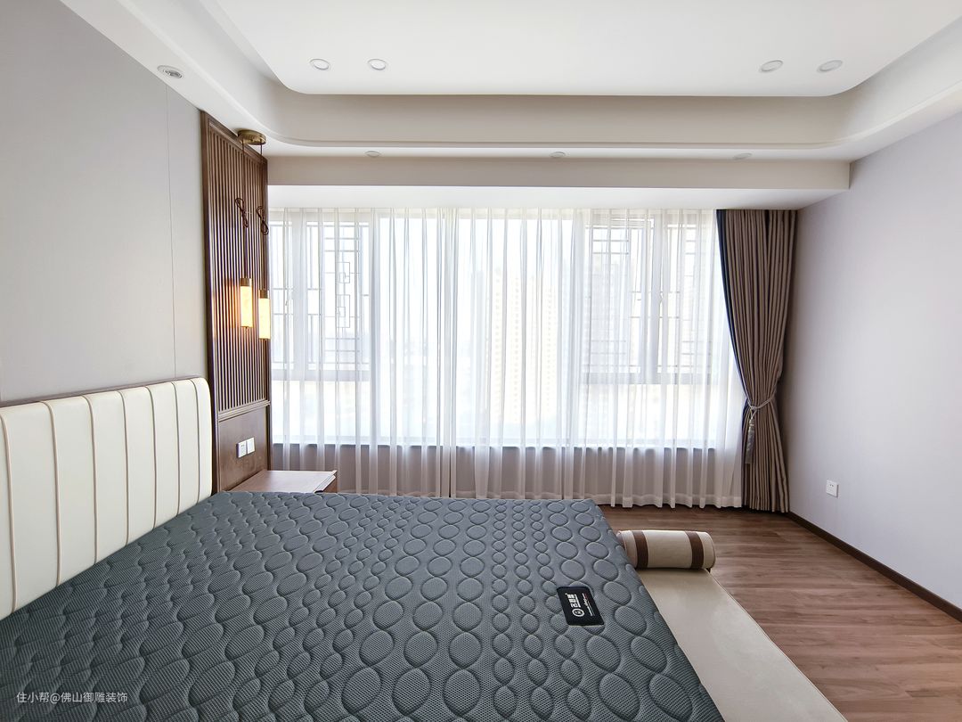 主卧室空间线条简练利落,文雅大气中透着些许远离喧嚣的宁静。顶面形式使空间更显中式气质和现代简约,格栅背景墙与床品布艺组合,诉说着主人满室风雅的个性。