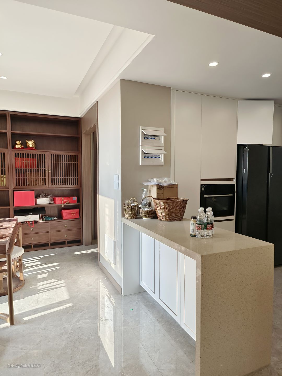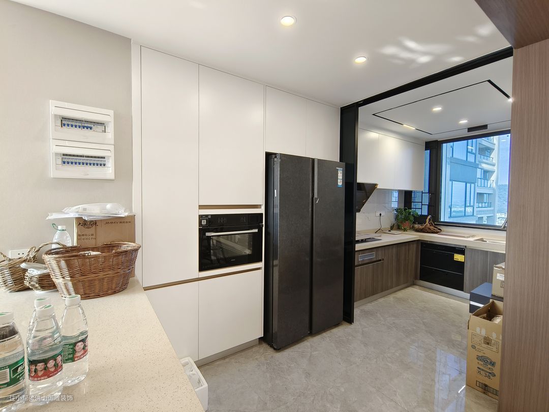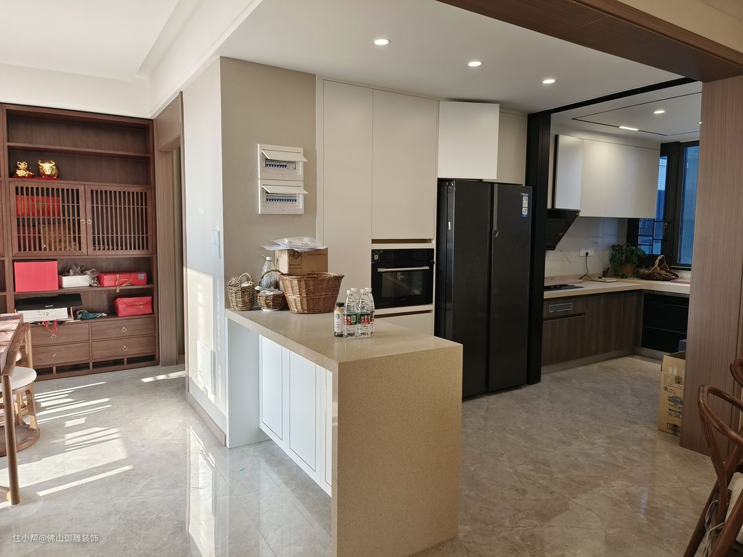 吧台下面做了一排柜子设计,方便收纳厨房用品,平时常住人员比较多,收纳空间必须充足,电箱也重新做了移位,放在这个吧台的位置,不会太影响美观,而且这个位置也比较合理。