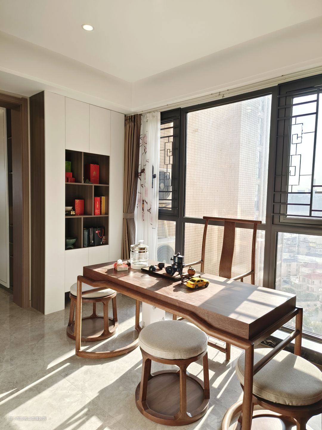 原本茶室的这个位置是一个小房间,把小房间打通后设计成一个开放式的茶室,中式风格让这个区域特别的有韵味,茶与书法是中国传统文化中最亮眼的两颗明珠,品茶论道、挥毫泼墨哪个更吸引你呢。