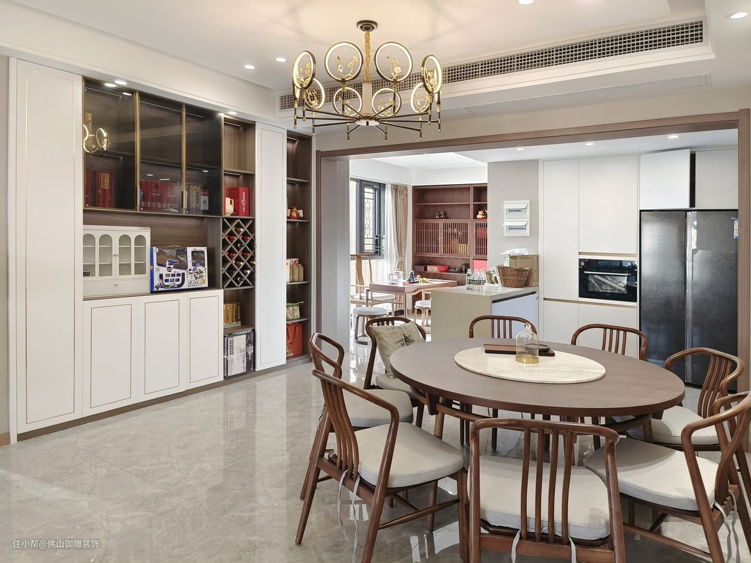 客厅、茶室与餐厅互相联通,整个公共空间宽敞流畅,增进了家人之间的沟通互动。餐厅延续着客厅的基调,选用低饱和度的餐桌餐椅,细腻而精致。
