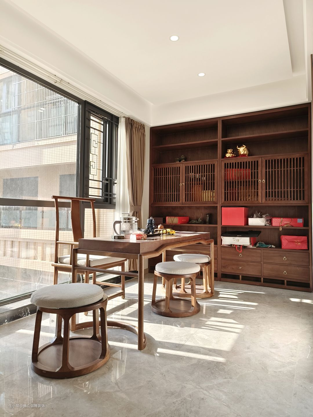 客厅,营造茶香墨韵天地。客来,以茶待客,沏一壶茶,满室清芬,品茗论道,长日清谈;独处,一几一案,时而品茶,翻阅书卷,时而挥洒笔墨,修身养性,隔绝喧嚣,回归恬淡心境。