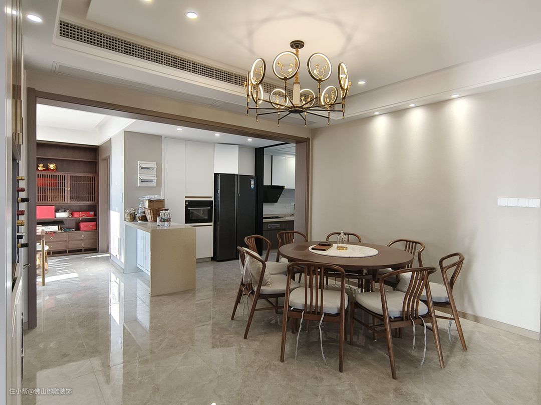最能代表中国传统文化的古式长桌,让人联想到浮萍的异型吊灯,大幅汪 洋姿肆的中式窗帘搭配,对比鲜明反差强烈,却又完美地融合在了一起,中式?西式?这大概就是新中式的魅力吧。