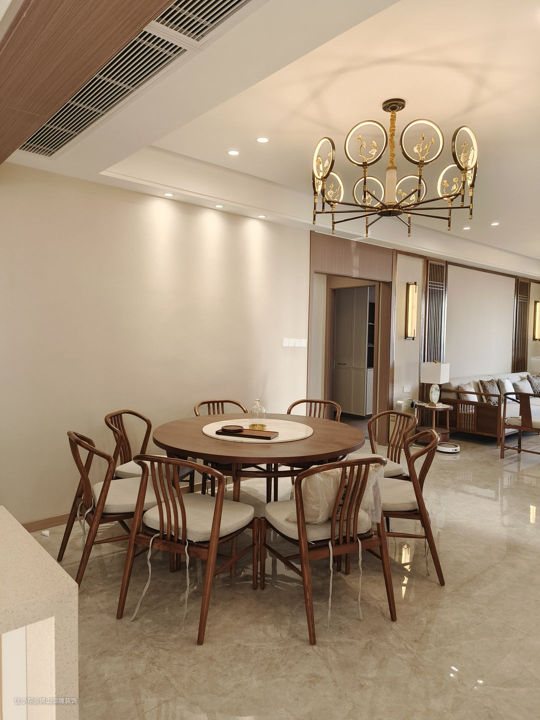 餐厅则是选用原木色中式圆桌,整体简洁,时尚感很强。圆形餐桌清柔大气,满足三代人共同用餐,同时也彰显出餐厅的仪式感。淡雅的鲜花和温暖的烛光相得益彰,共同烘托出餐厅的温馨格调。