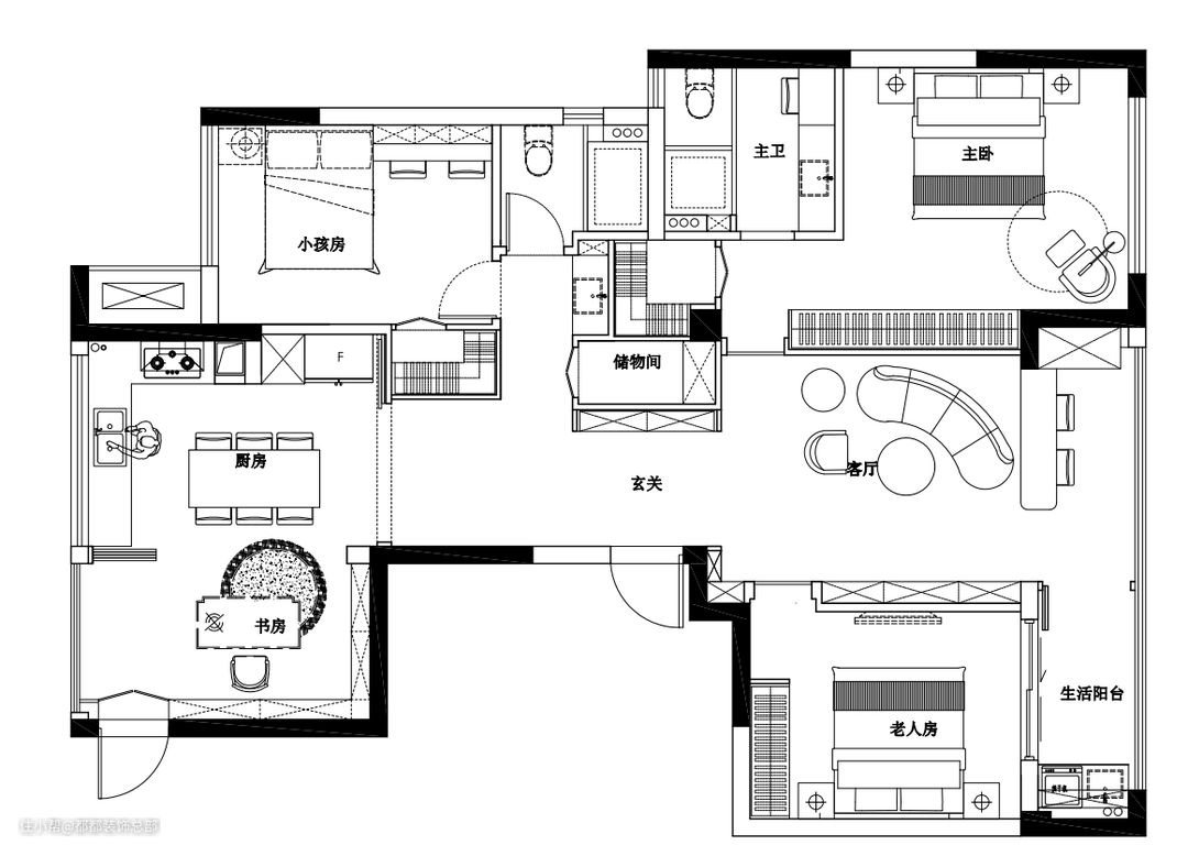 屋主是一对年轻夫妻,作为杭州本地人的钱女士是重度阅读发烧友,性格开朗热情,爱好看书,文艺气质爆棚,目前在阿里巴巴上班,整屋常年6口人居住,这一次装修她希望一改家的陈旧面貌,用温馨的暖黄色调,重塑出质感简约的家。 丈夫有很多机械器材用来做手工用的,储物空间需要足够大,我们以开放式餐厨,联动客厅,打造LDK公共区,将Living Room(客厅)、DiningRoom(餐厅)、Kitchen(厨房)放在同一个开放空间内,构成家的核心区,空间开阔如风;在细节处,我们用格栅、线性灯、原木等个性元素填充,配合干净利落的线条,让平平无奇的140㎡四居室,焕发出全新魅力。 户型分析: 1.丈夫平时做的手工机械器材很多,所以希望客厅也能有放材料、放书和看书的空间; 2.客厅和卧室的两个阳台被墙体分割,空间窄小,行动总感觉不自在; 3.原始户型一进门厅就是卫生间,导致常年进门处湿嗒嗒的,异味容易扩散。 户型改造: 1.在开放的餐厨空间隔出一间书房来,L型靠墙的定制柜完全保障了丈夫的储物需求; 2.将两个阳台的隔墙打掉,客厅阳台包在客厅内,客厅空间更开阔,靠近卧室的生活阳台也满足日常使用; 3.在进门处设置储物间和玄关,美观又实用,卫生间干区藏于玄关转角处,整体看上去大气不少。