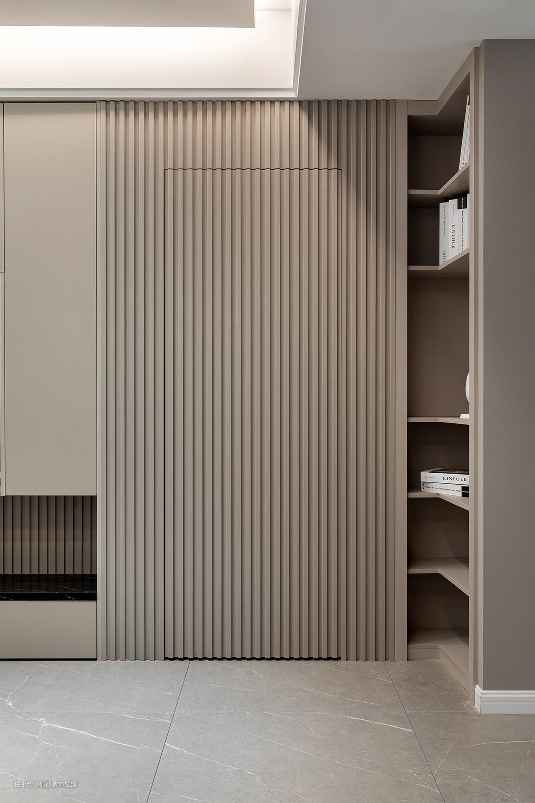 靠墙处定制400mm宽度的米黄色鞋柜,这样子大鞋子就能很轻松地放进去,而且刚好能将柜门关上。