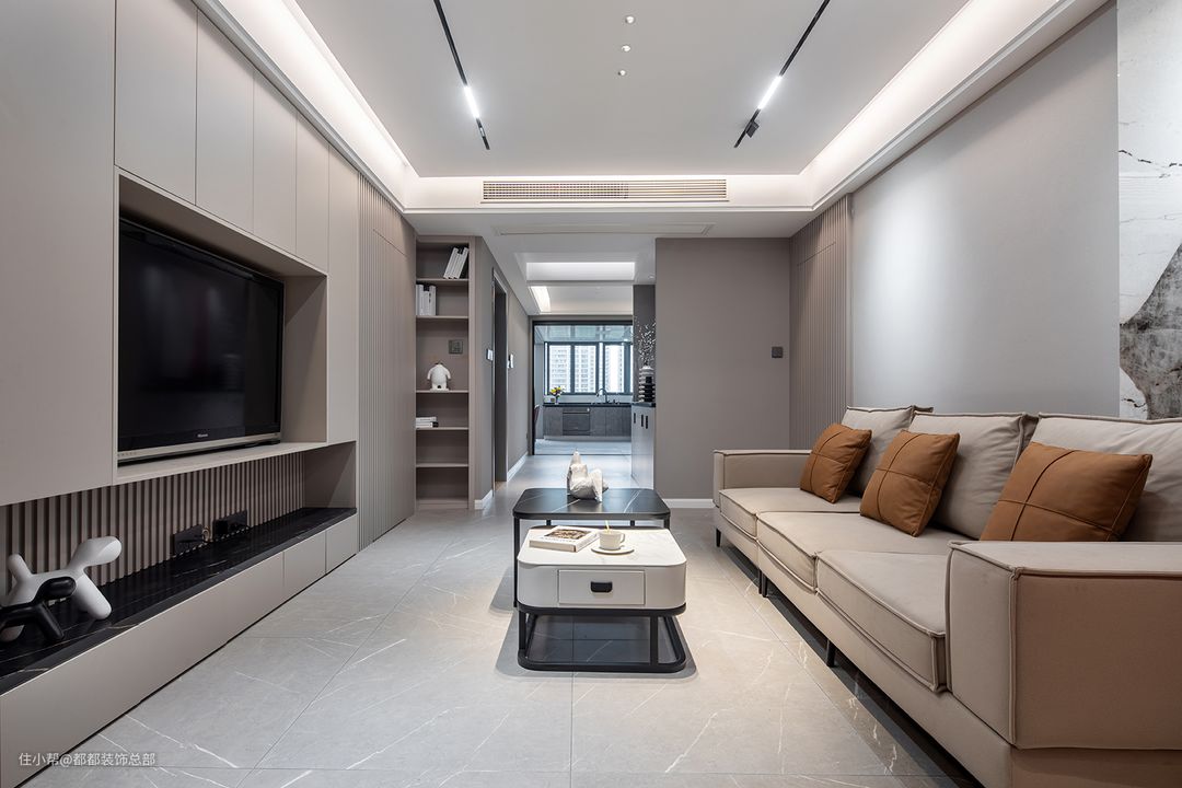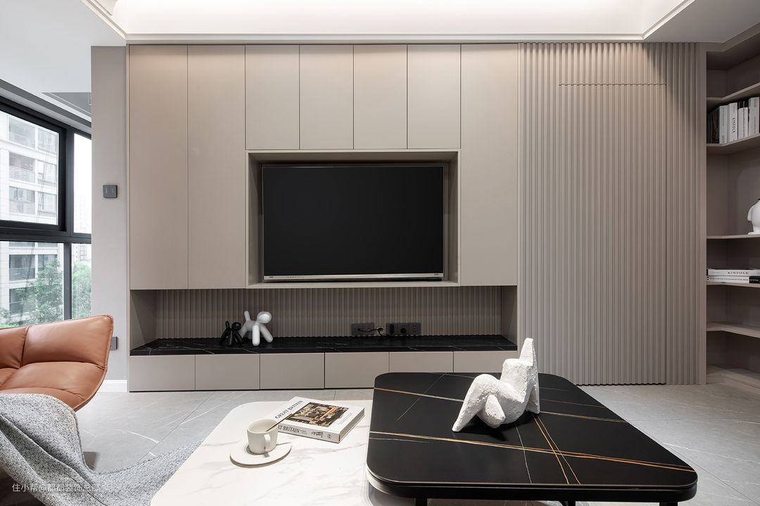 电视背景墙也是设计师很细心做的一个方案,满墙电视柜功能、颜值想要的都有了,原木结构板让全屋收纳最大化,浅卡其的配色让整面的柜子不压抑,中间留空的开放式设计让客厅更透气,控制预算的同时还达到最好效果!