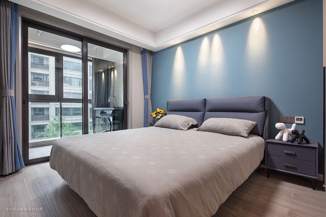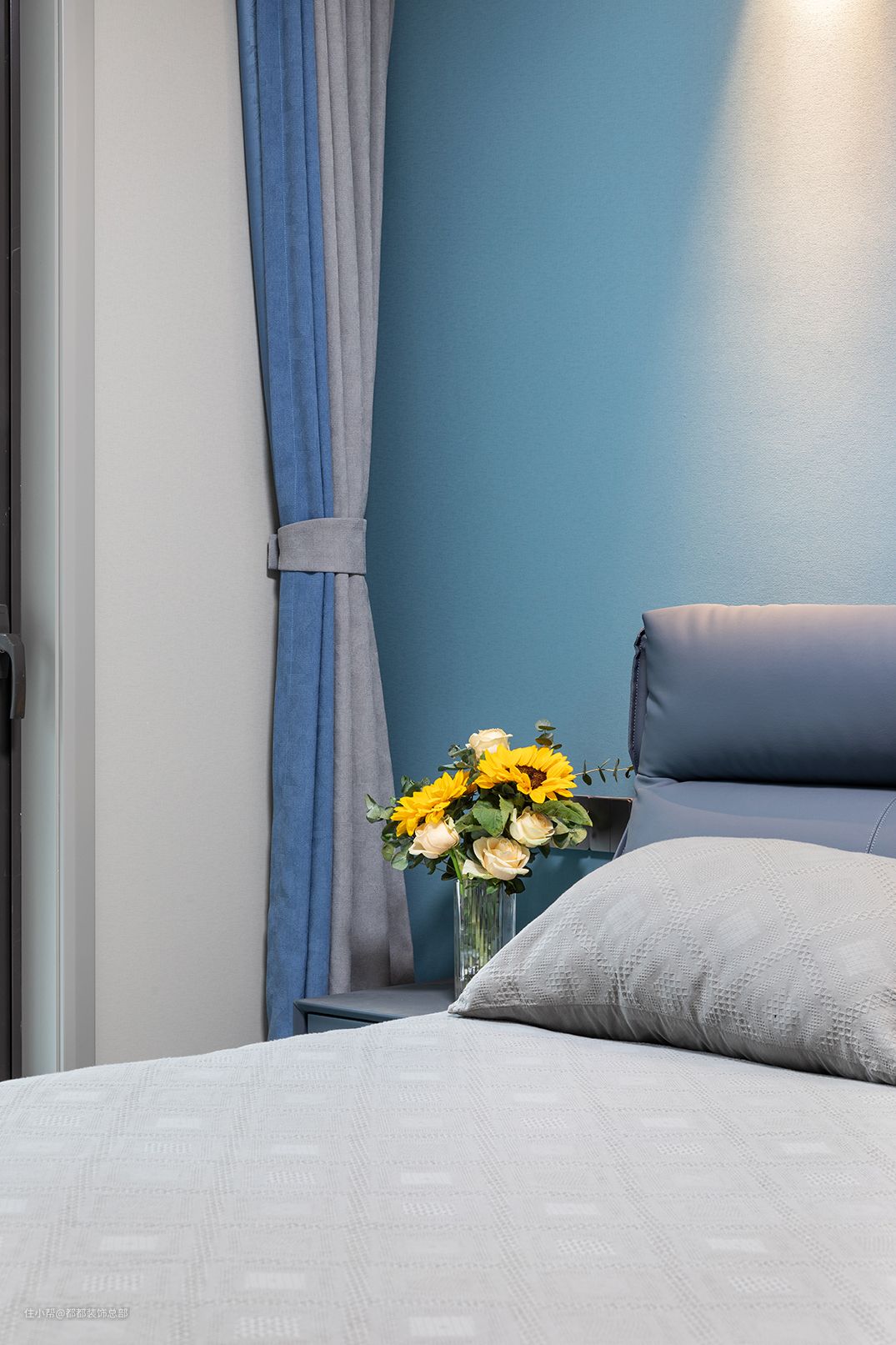 次卧有一个大阳台,采光是非常充足,视野也很好,整体是天空蓝和浅白色的拼接,清新且低调的色系营造的舒适的休憩环境;布艺软包的床品与木质衣柜满足了卧室一定的储物需求。