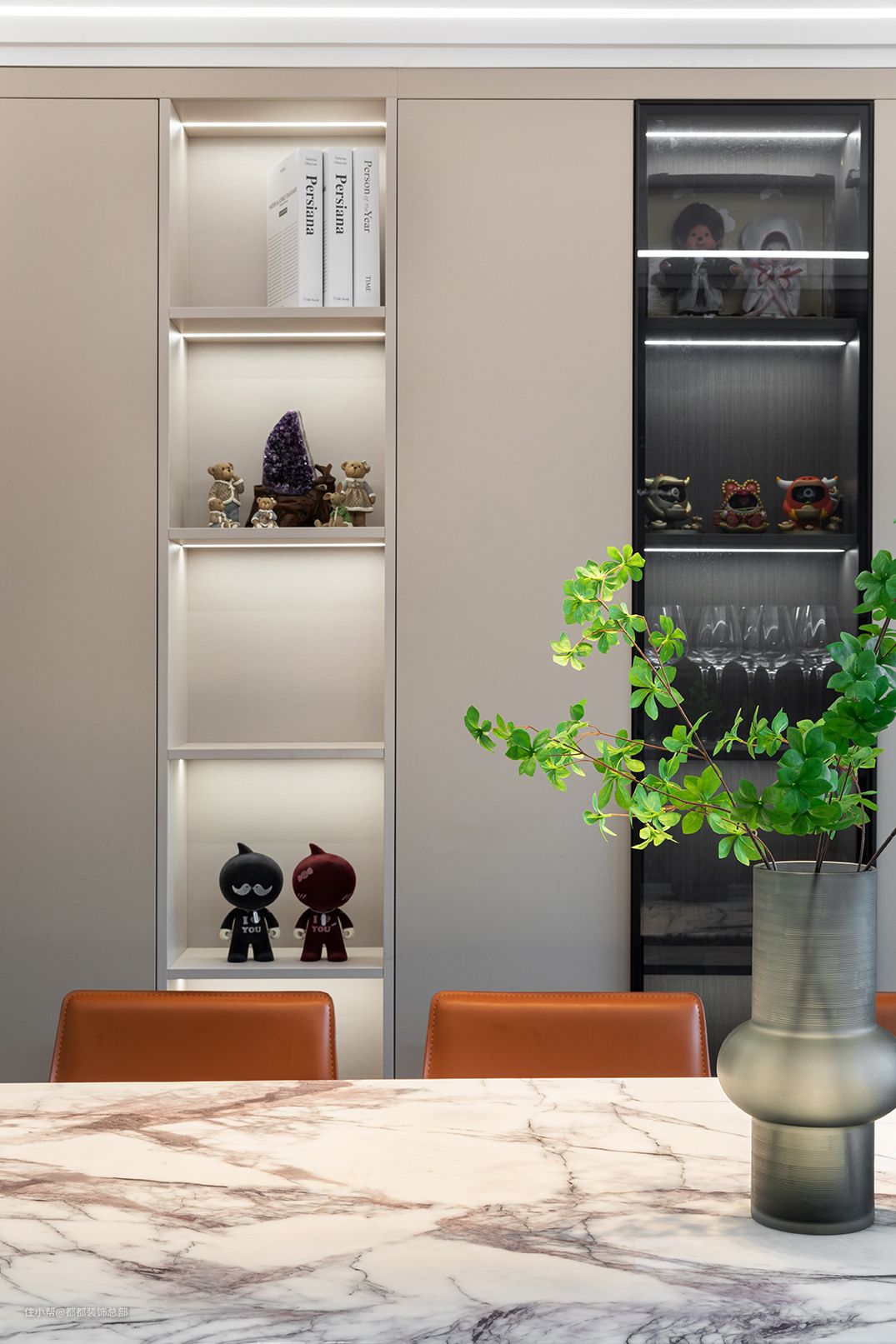 开放式餐厅的布局,暖色调的餐桌椅搭配上绿植装饰,生命力满满,让人心情舒畅,大理石岩板桌面在中性的色调下,融入低调的奢华感设计,营造更温馨、高级的用餐环境。