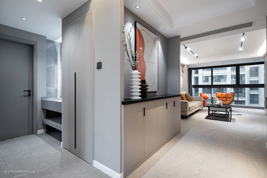 一走进钱女士家,透过玄关这个小角落就能感受到扑面而来的活力,橙白撞色的线条挂画放在中央墙面一下就不空旷了,搭配着小射灯的灯影更契合钱女士家简约现代的装修风格,黑白螺旋造型的花瓶设计感十足。
