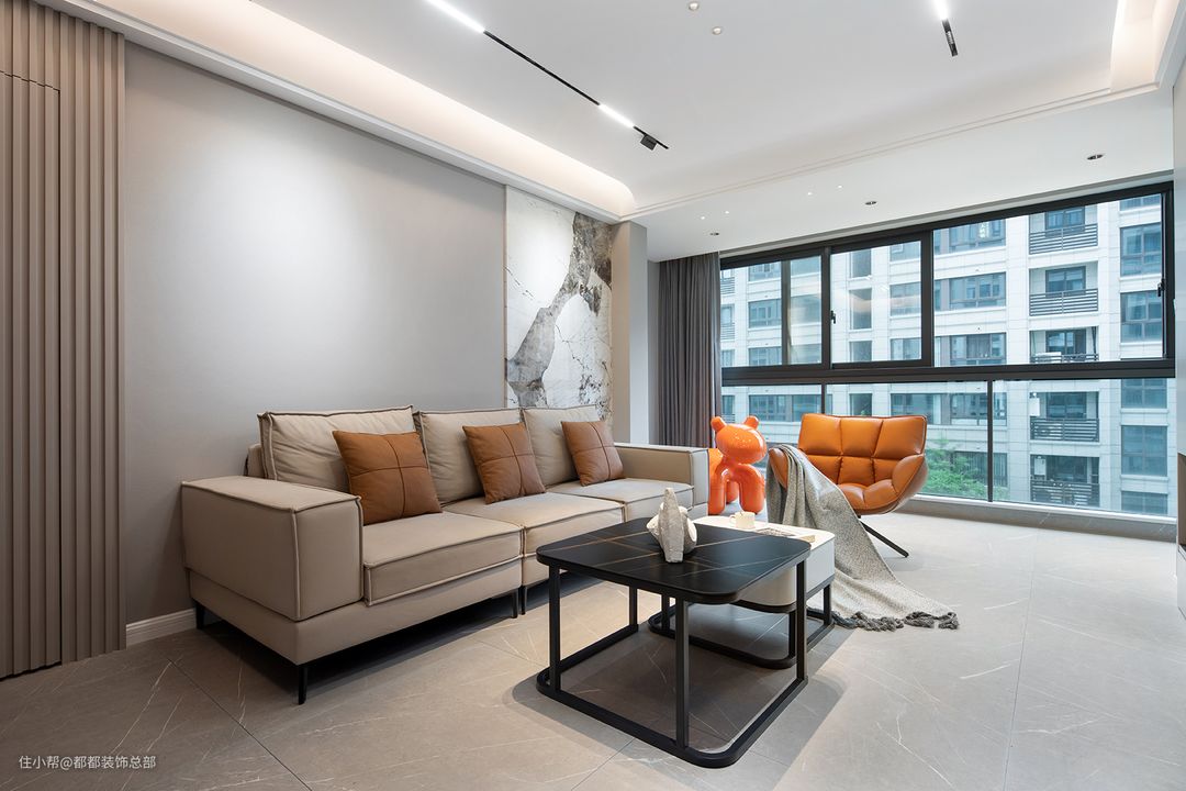 靠近阳台的沙发背景墙单独用到了雪花白大理石材质,预防潮湿的同时还增加了美感;灰色颗粒感的毛毯铺在懒人沙发上,几个姜黄色小抱枕点缀其中,瞬间给原本沉稳的空间提亮了效果。