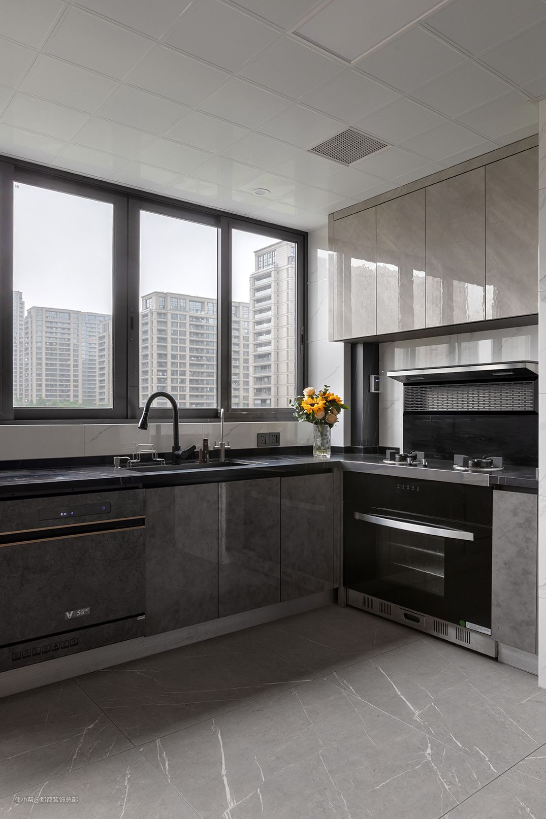 依靠墙直接做成L型厨房,整体开阔大气、动线流畅,灰咖色的清冷能减少几分夏日的燥热,因为凉爽的环境能很好地舒缓做饭人的心情,心情决定菜肴的味道哦!