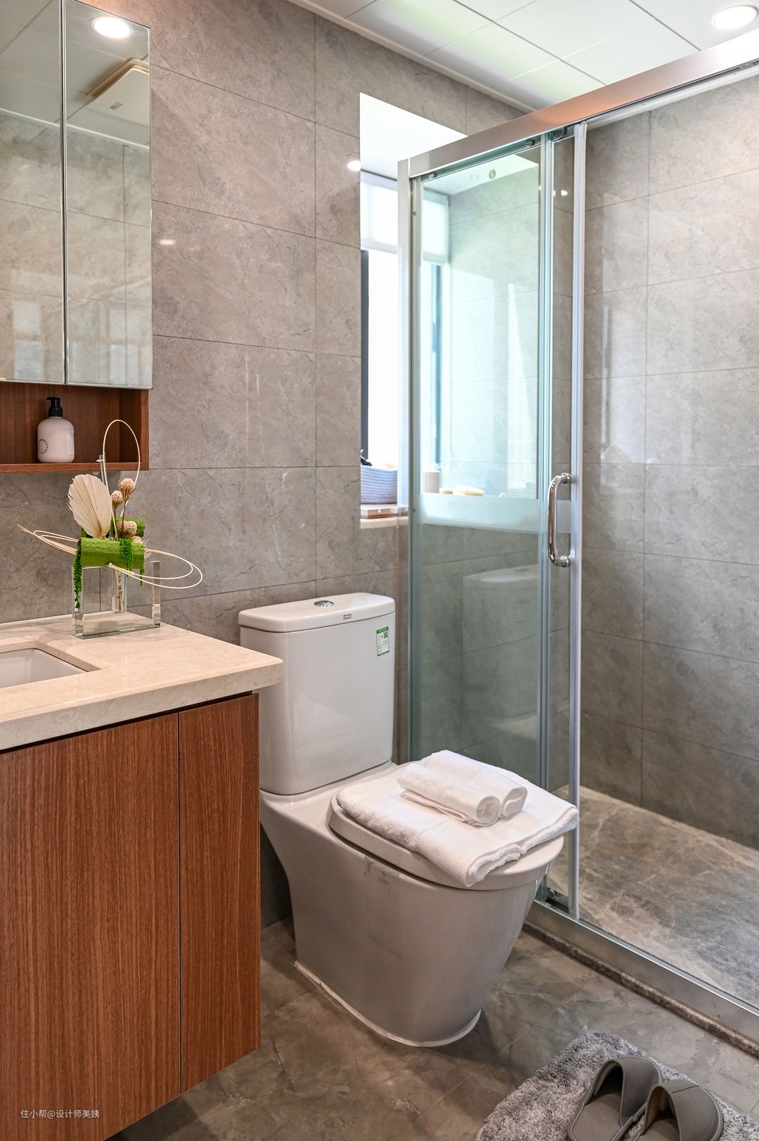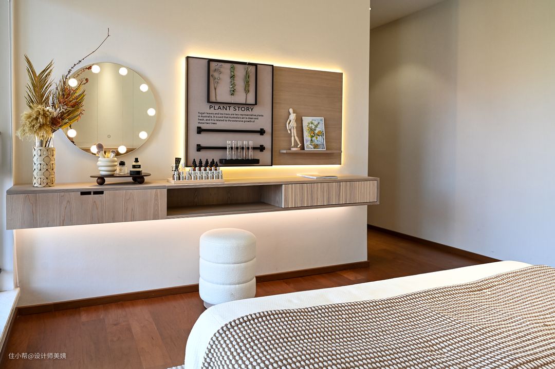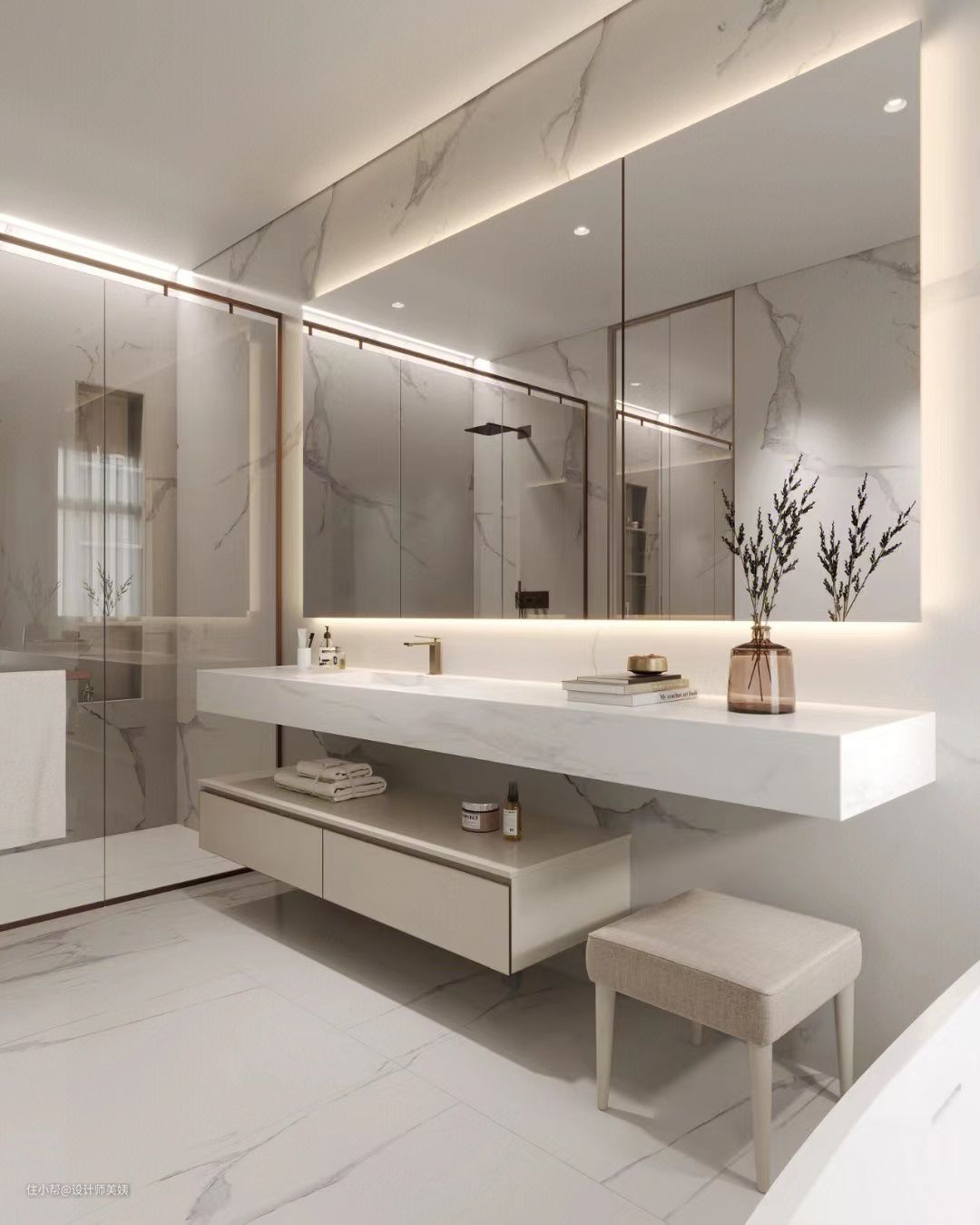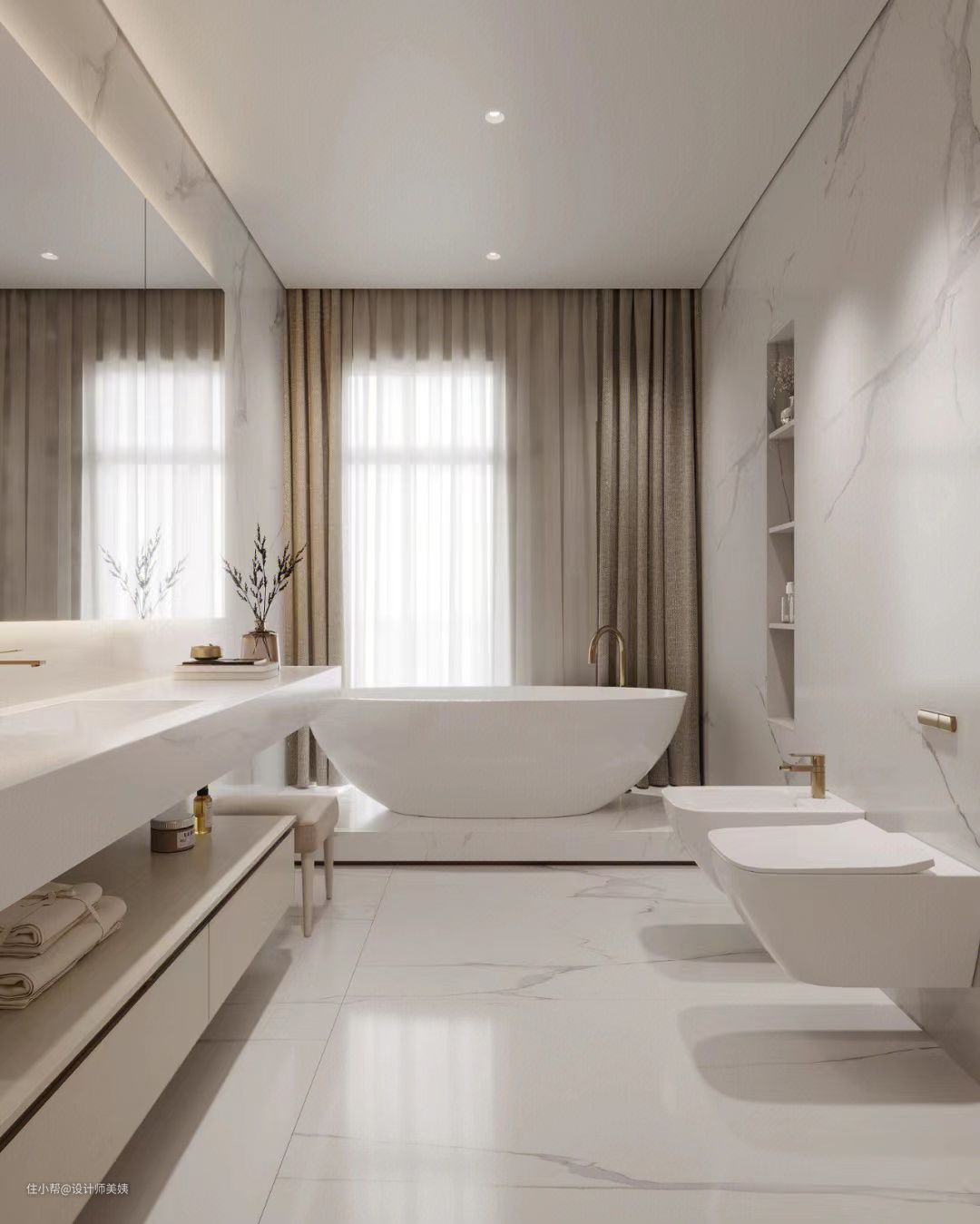 主卫在素色的包裹下,呈现一种现代轻奢风的都市格调,让空气中弥漫了品味感,引爆了一场时尚的视觉盛宴。 主要采用大理石瓷砖通铺,并且运用多种同色系的家居装饰搭配,既丰富了视觉效果,也让空间氛围感更佳。 浴室的门口进来就是浴室柜,这次选用的是现代极简风的双层柜体,形象更为时尚,而且在灯光的烘托下,细腻的质感一览无遗,充满高级感。宽大的台面+双抽屉储物,物品分类放置清清爽爽。还带有梳妆台哦,洗漱化妆也更方便! 落地窗位给浴室提供了充足的采光,光从窗帘的缝隙透进来,彷佛整个空间上了一层柔光滤镜,再加上独立式浴缸🛀,在家就能随时享受泡澡的快乐! 一楼公卫相对简约,墙排系列为颜值加分,卫生间是家里使用频率很高的地方,好看的颜值让人心情愉悦: √简约灰白搭配原木色系,清爽干净; √墙排龙头+墙排下水+墙排马桶,方便日常打扫; √定制悬挑台盆,高颜值有质感。
