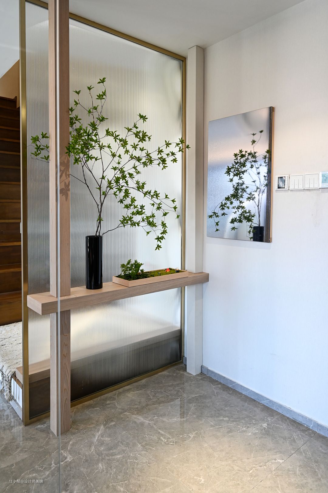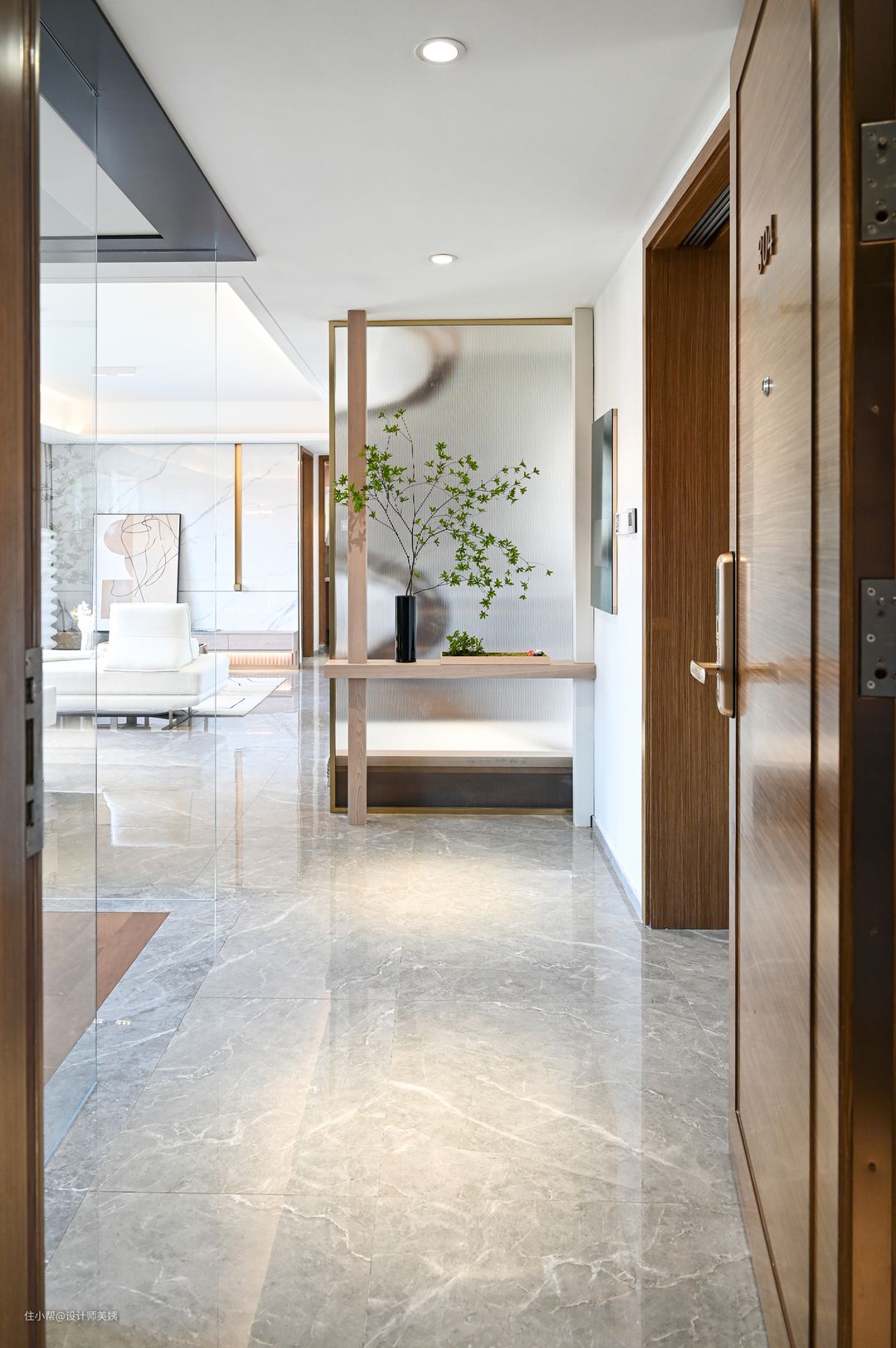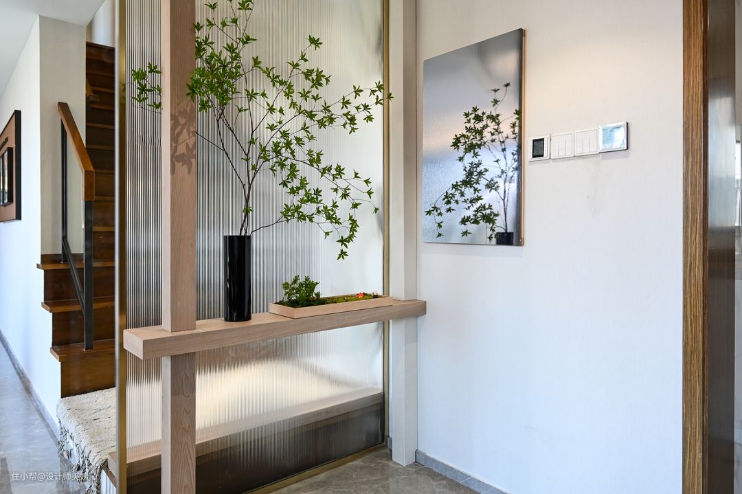 本案为九零后年轻业主的婚房 ,男业主从事金融,女业主从事房产项目,客户二人都是在日本留学归来的海龟。自从口罩时期开始,孩子就经常不间断停课,母亲也搬进来陪伴孩子。 男业主对于家的憧憬是简约,有点日式风,但不必过于张扬,女业主则偏爱冷白的基调! 简约不仅是一种风格,更是男业主的一种生活态度,白色也不仅仅是女业主的钟情色,更是她低调而不失优雅的个性体现,正是如此,才缔造了这个组合:高级白+现代简约风,就如同男女业主之间的相遇-恰到好处。 这个像挂了画又没挂的玄关背景墙必须是屋主家出彩的设计之一,所有亲戚朋友走进屋主家的第一眼都会被它惊艳到! 玄关是家里的第一道风景线,也是一个很有仪式感的装修空间。玄关设计不止是为了好看,也是因为屋主不喜欢入户楼梯直勾勾对着门口,所以我们使用了长虹玻璃做隔断,定制了玄关桌,摆件,绿植点缀,结合屋主家的简约家居风格,打造了这个被粉丝们称为奢华而又内敛,高品味而又低调的玄关造景! 本来屋主是想直接用2.5米高的长虹玻璃上墙的,可惜进不去电梯。只能按玄关桌的高度80cm切成两块分开上楼,这样玄关桌刚好可以遮住切痕,不摊牌的话你们都看不出来的。 玄关懒人绿植的选择,我推荐用金龙柳,马醉木,北美冬青,小手球等来点缀。北美冬青是红果子那个,入宅和春节摆上,特别应景!其他可根据一年四季不断更换。