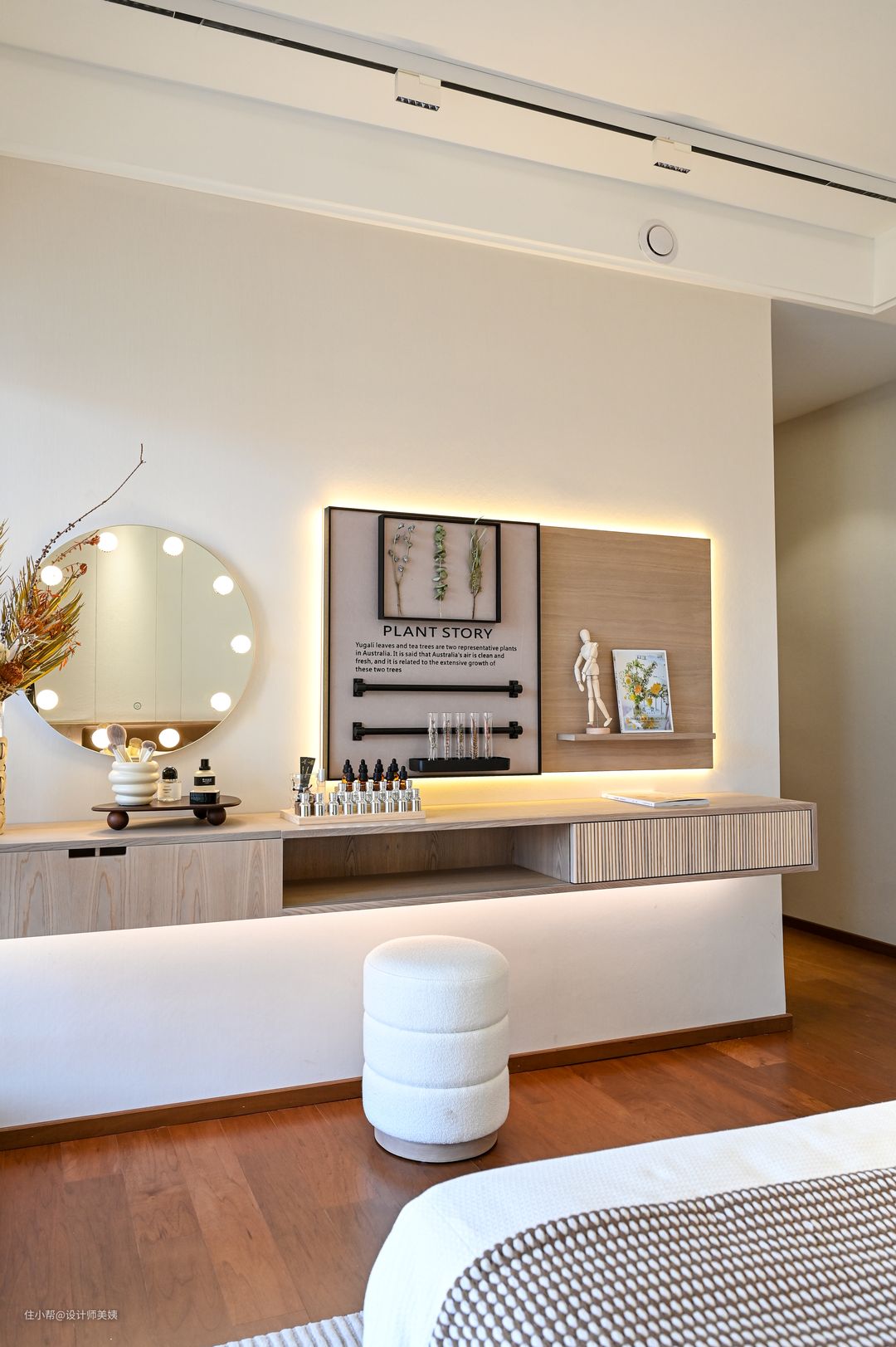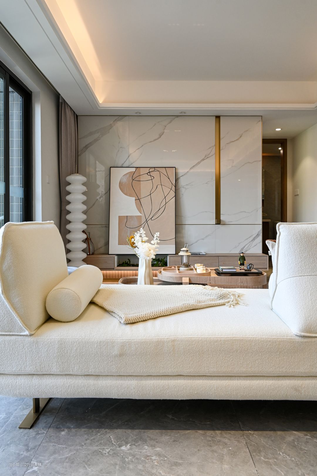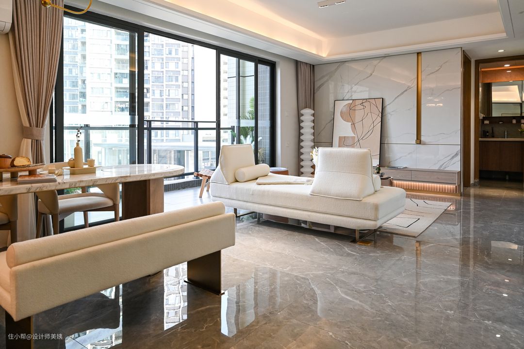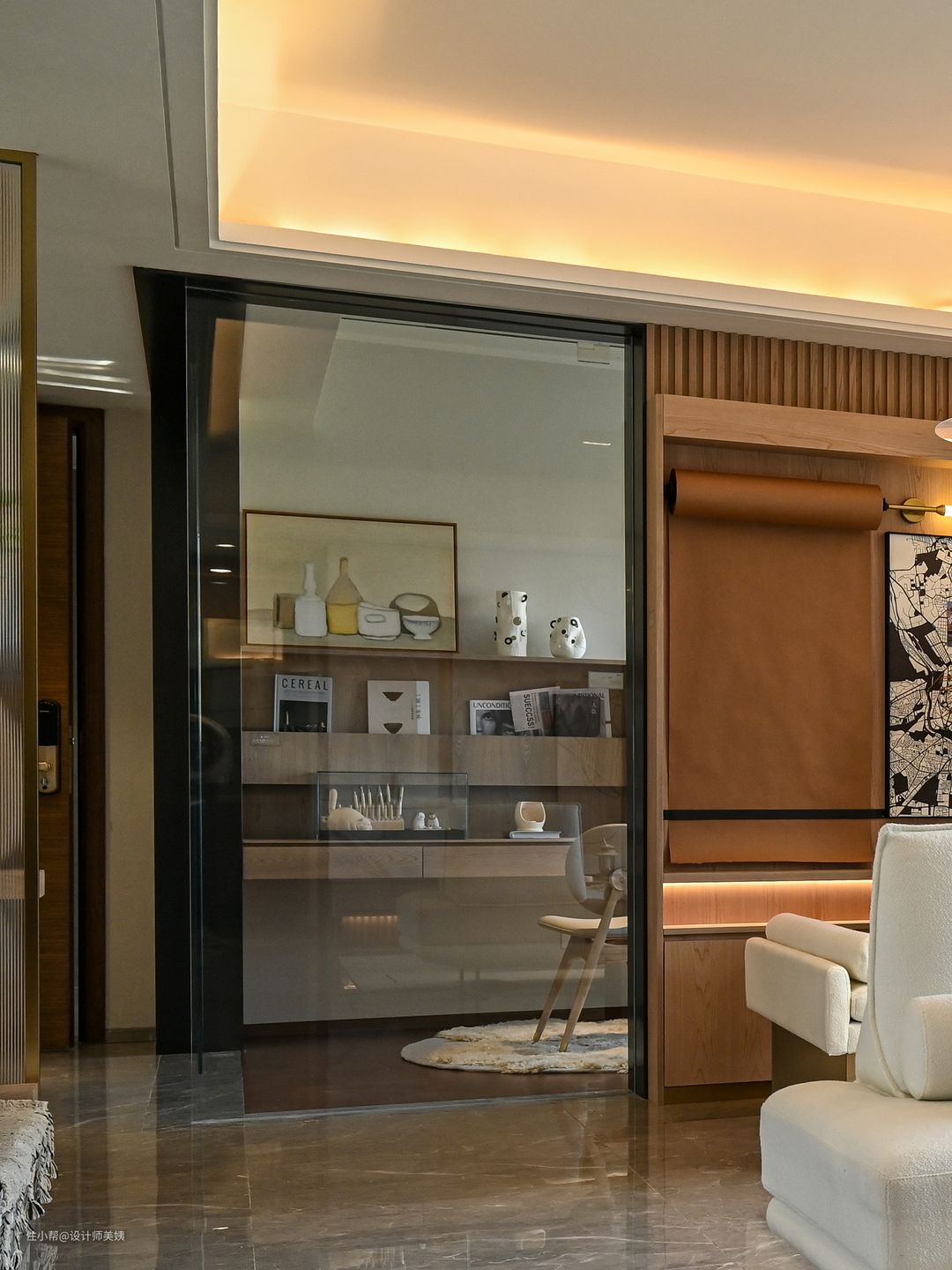 本案为九零后年轻业主的婚房 ,男业主从事金融,女业主从事房产项目,客户二人都是在日本留学归来的海龟。自从口罩时期开始,孩子就经常不间断停课,母亲也搬进来陪伴孩子。 男业主对于家的憧憬是简约,有点日式风,但不必过于张扬,女业主则偏爱冷白的基调! 简约不仅是一种风格,更是男业主的一种生活态度,白色也不仅仅是女业主的钟情色,更是她低调而不失优雅的个性体现,正是如此,才缔造了这个组合:高级白+现代简约风,就如同男女业主之间的相遇-恰到好处。 这个像挂了画又没挂的玄关背景墙必须是屋主家出彩的设计之一,所有亲戚朋友走进屋主家的第一眼都会被它惊艳到! 玄关是家里的第一道风景线,也是一个很有仪式感的装修空间。玄关设计不止是为了好看,也是因为屋主不喜欢入户楼梯直勾勾对着门口,所以我们使用了长虹玻璃做隔断,定制了玄关桌,摆件,绿植点缀,结合屋主家的简约家居风格,打造了这个被粉丝们称为奢华而又内敛,高品味而又低调的玄关造景! 本来屋主是想直接用2.5米高的长虹玻璃上墙的,可惜进不去电梯。只能按玄关桌的高度80cm切成两块分开上楼,这样玄关桌刚好可以遮住切痕,不摊牌的话你们都看不出来的。 玄关懒人绿植的选择,我推荐用金龙柳,马醉木,北美冬青,小手球等来点缀。北美冬青是红果子那个,入宅和春节摆上,特别应景!其他可根据一年四季不断更换。