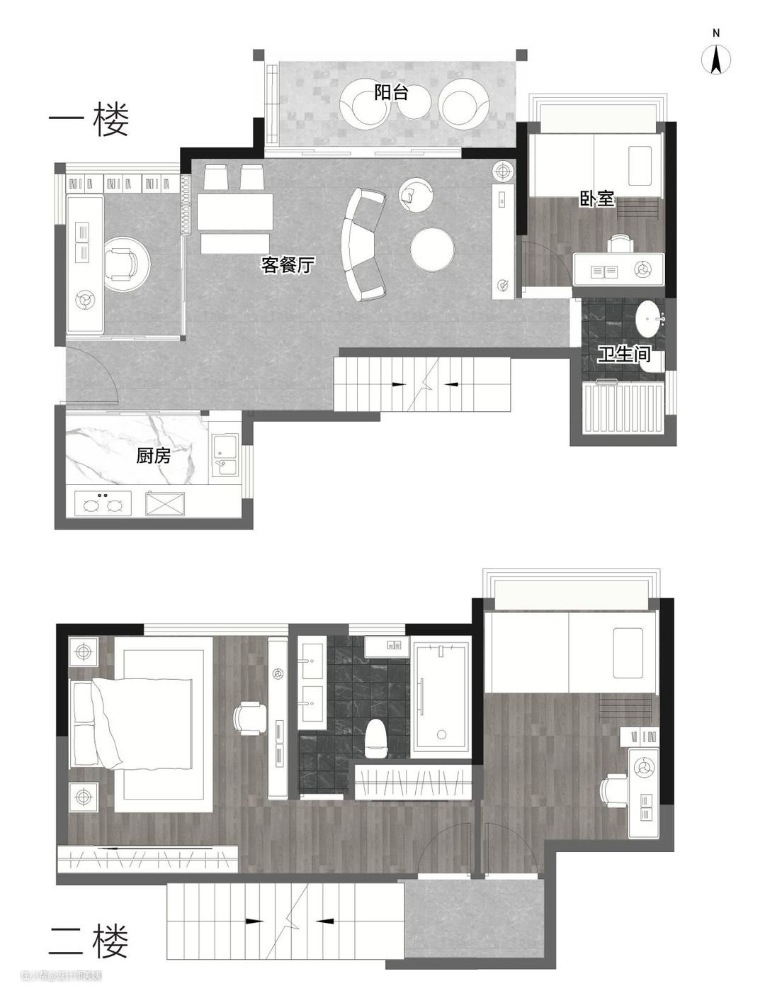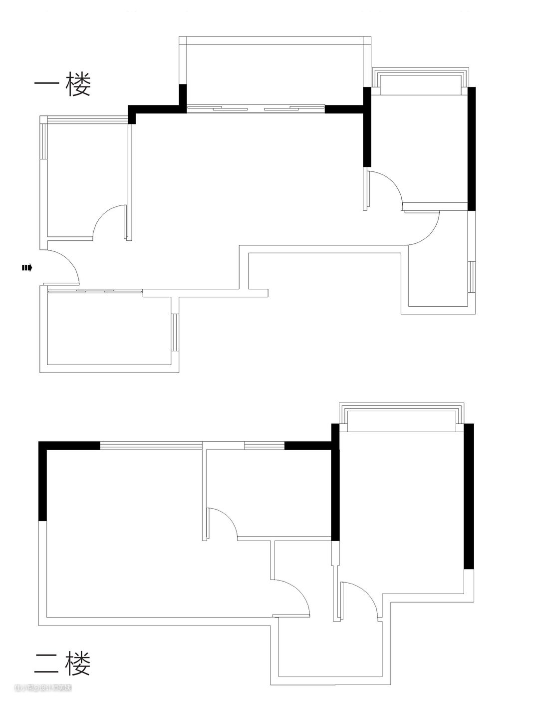 【原始户型图】 一层分布为客餐厅、厨房、两间卧室,二层为主卧、和儿童房。 屋主需求: 1.进门就想要更宽敞的效果; 2.楼梯正对入户大门,有点压抑; 3.二楼走廊通道大片面积浪费了。