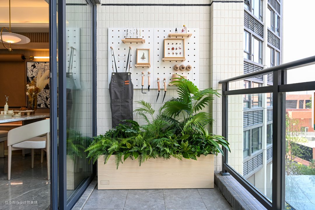 家政阳台是和餐厅连在一起的,面积大约有5平米,屋主母亲很喜欢种些花花草草,所以安排了种植工具洞洞板,让这个小小的空间满足屋主母亲的兴趣和收纳! 种植工具越来越多,量好尺寸在网上定制了这个金属洞洞板,安装在阳台墙上刚刚好,尺寸:450*700 ×2块,把种植工具都上墙收纳起来真的节省了不少空间,这样拿取使用也超级方便。
